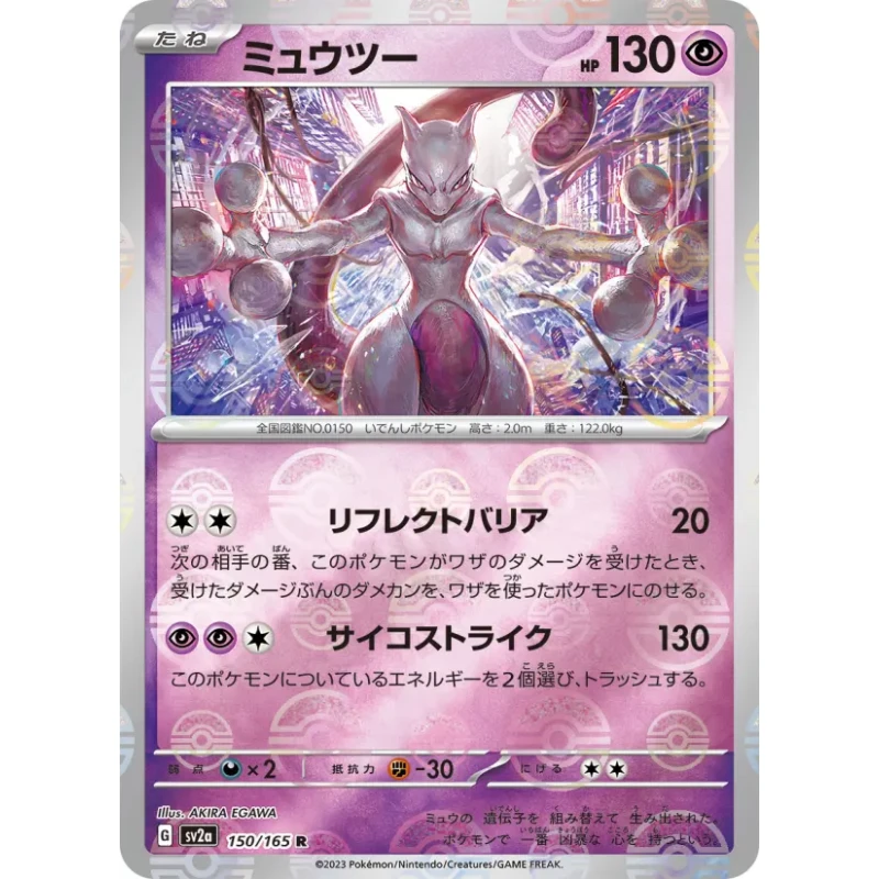Mewtwo card from the Scarlet & Violet 2 (SV2) set with collector number 150/165. Japanese language version. Illustrator: AKIRA EGAWA. This is a rare holo card featuring psycho and barrier attacks. The card is foil with a holo treatment. Playable in meta decks using psychic type strategies.