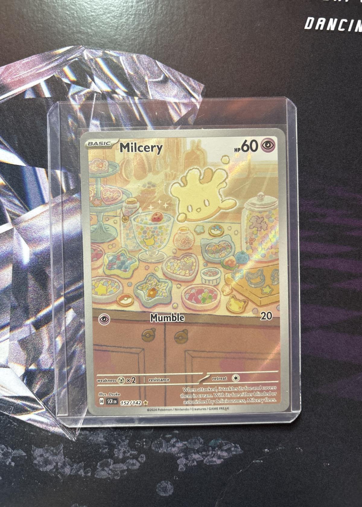 This is a Milcery card (152/142) from Scarlet & Violet: Paldean Fates (SVR, English, 2024). Special Illustration Rare with holofoil treatment, this card features artwork by Duse. Card code: 152/142. Part of a limited set, this card is mainly collectible due to its rare treatment and charming illustration. Not a meta staple but highly desirable for collectors. Not graded or slabbed.