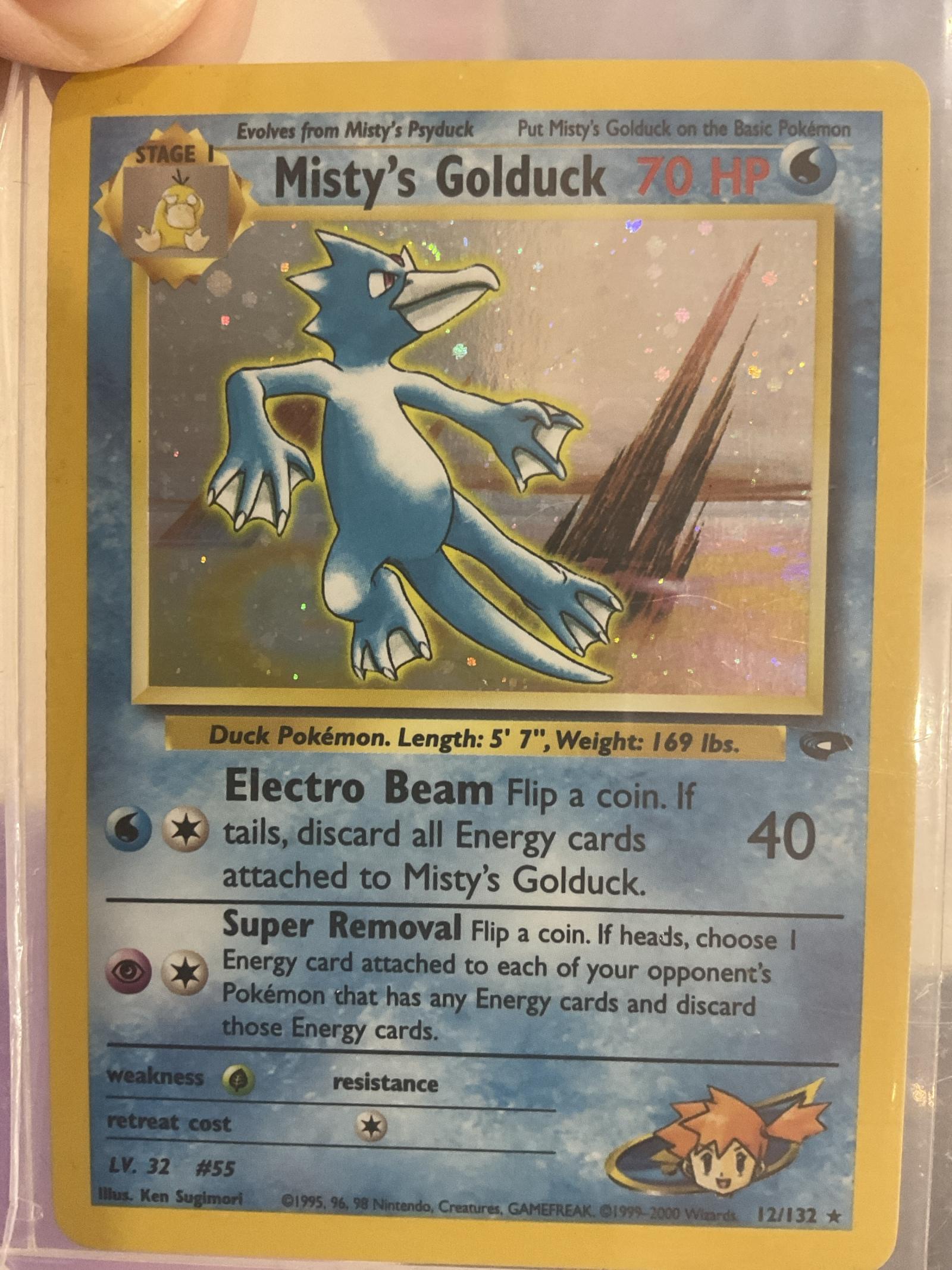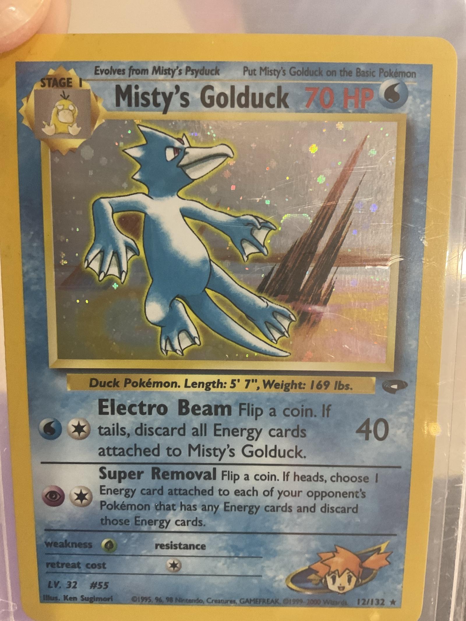 Misty's Golduck holographic card from Gym Challenge Unlimited Set. Card number 12/132, illustrated by Ken Sugimori. This Water-type Stage 1 Pokémon evolves from Misty's Psyduck. Featuring the moves Electro Beam and Super Removal. This card is collectible with holo foil treatment and has notable vintage value but less relevance in current competitive play.