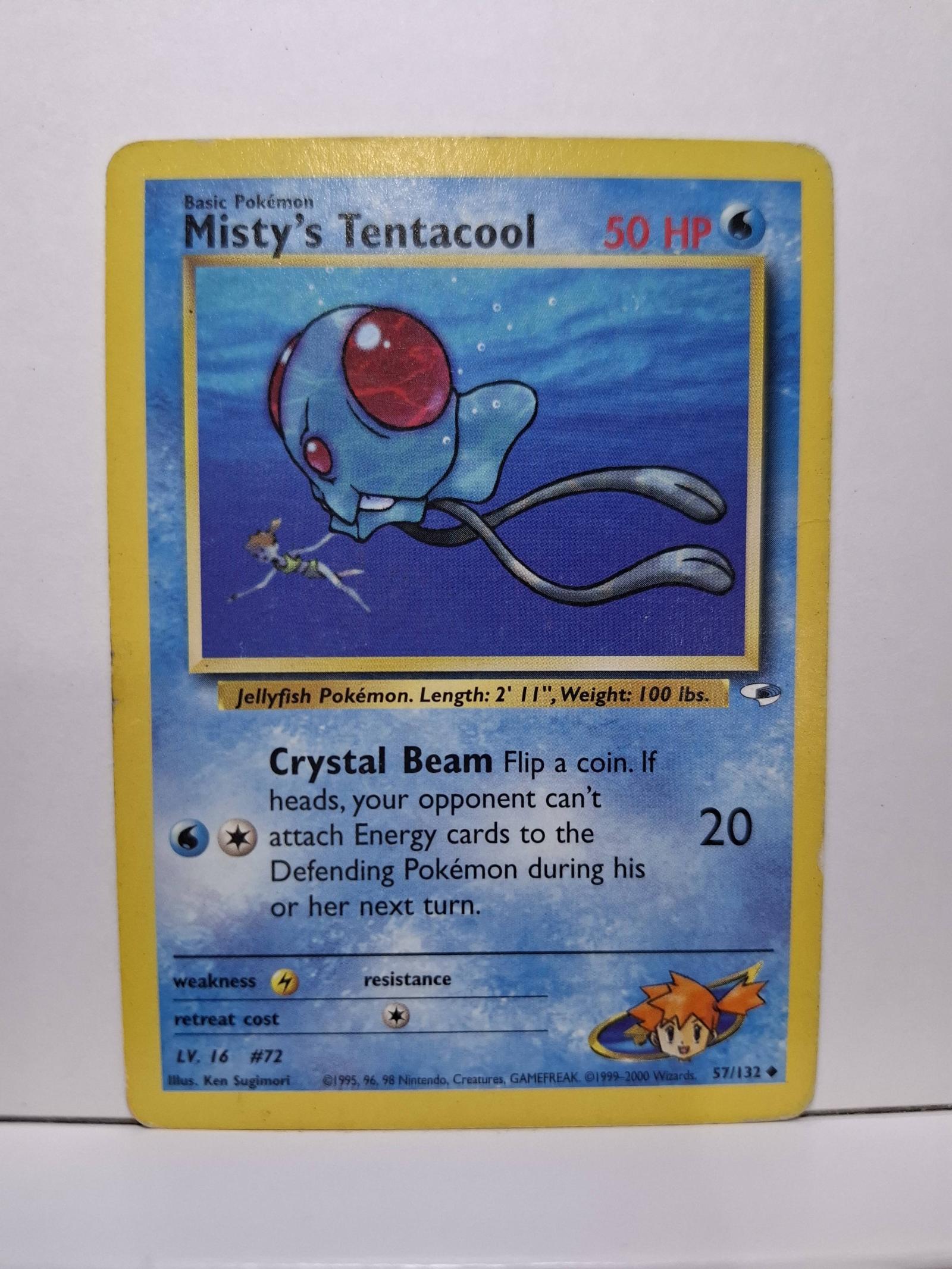 Misty's Tentacool from the Team Rocket set, card number 57/132. Artist: Ken Sugimori. This English card features the 'Crystal Beam' attack and 50 HP. It is a non-foil card playable in the Pokémon TCG. Classic Team Rocket design includes Misty's icon in the corner.