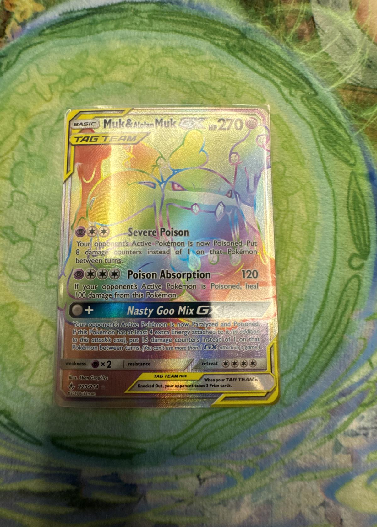 Muk & Alolan Muk GX is a TAG TEAM Pokémon-GX card from the Sun & Moon: Unbroken Bonds set, card number 220/214. The card features the Secret Rare rainbow foil treatment. The card's attacks include Severe Poison, Poison Absorption, and Nasty Goo Mix GX. This specific card is highly collectible due to its secret rare and rainbow artwork, and is not typically seen in meta competitive play. The artist for this card is 5ban Graphics, and the 6-digit card code displayed is 220214. The set is 'Unbroken Bonds.'