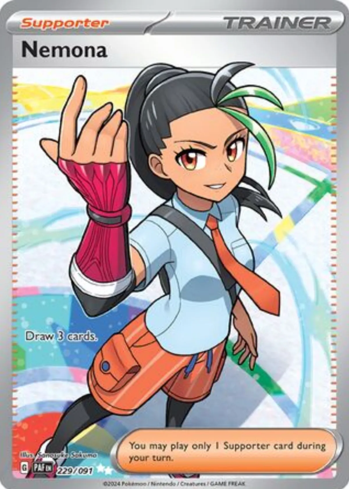This is a raw, ungraded Nemona Full Art Supporter card from the Pokemon Scarlet & Violet set, numbered 229/091 with a star rarity indicator. Featuring vibrant artwork by Sonyuuta Sakimori, this card stands out with its dynamic character illustration and clean design. As a Supporter Trainer card, Nemona allows you to draw 3 cards, which makes it a valuable pick for deck-building strategies. The card is popular among collectors and players for its unique art and utility in the meta, particularly in Scarlet & Violet format decks. Being raw and ungraded, it is ideal for collectors or players looking to add a striking and functional Supporter card to their collection or gameplay.