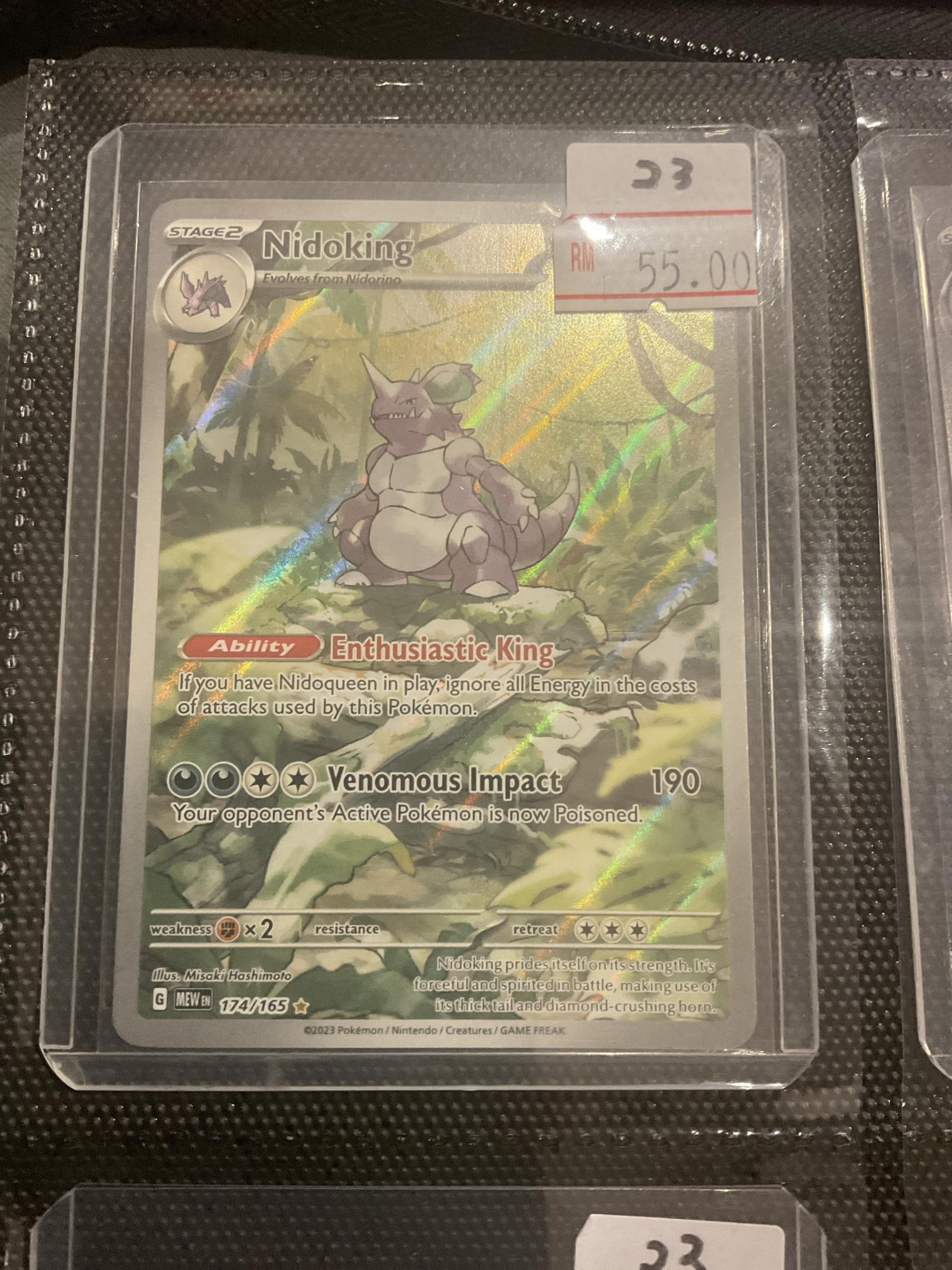 Nidoking #174/165 from the Pokemon TCG Sword & Shield 'MEW' set, illustrated by Misaki Hashimoto. This is a rare holo card featuring the Enthusiastic King ability and Venomous Impact attack. The card is collectible and playable in the current meta. Foil rare with a star set symbol. Language: English.