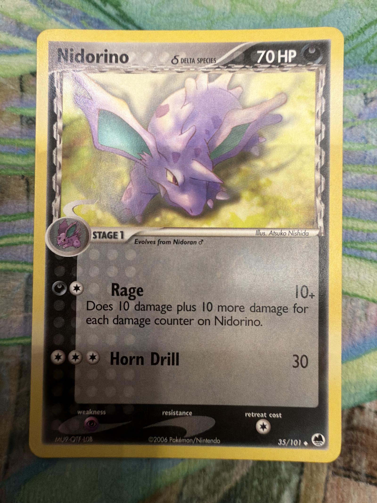 Nidorino card from the EX Delta Species set (2006), card number 35/101. Artwork by Atsuko Nishida. This card features the Delta Species symbol and is a normal printing, non-foil. Playable but more commonly collected due to its unique Delta Species variant.
