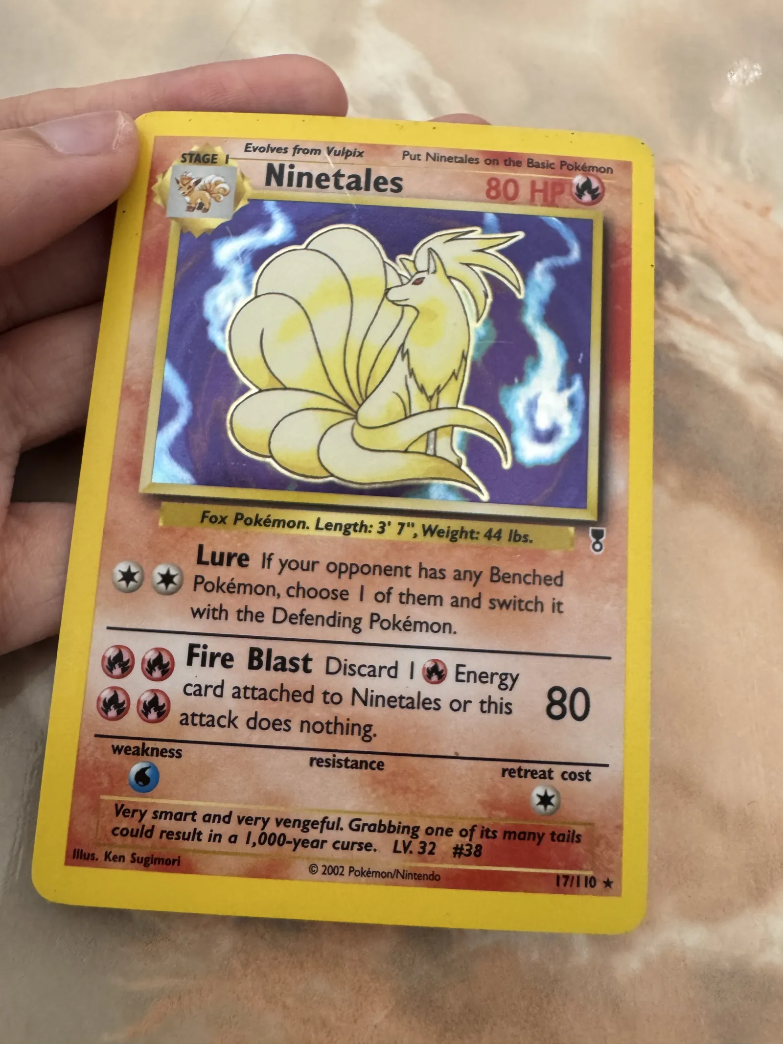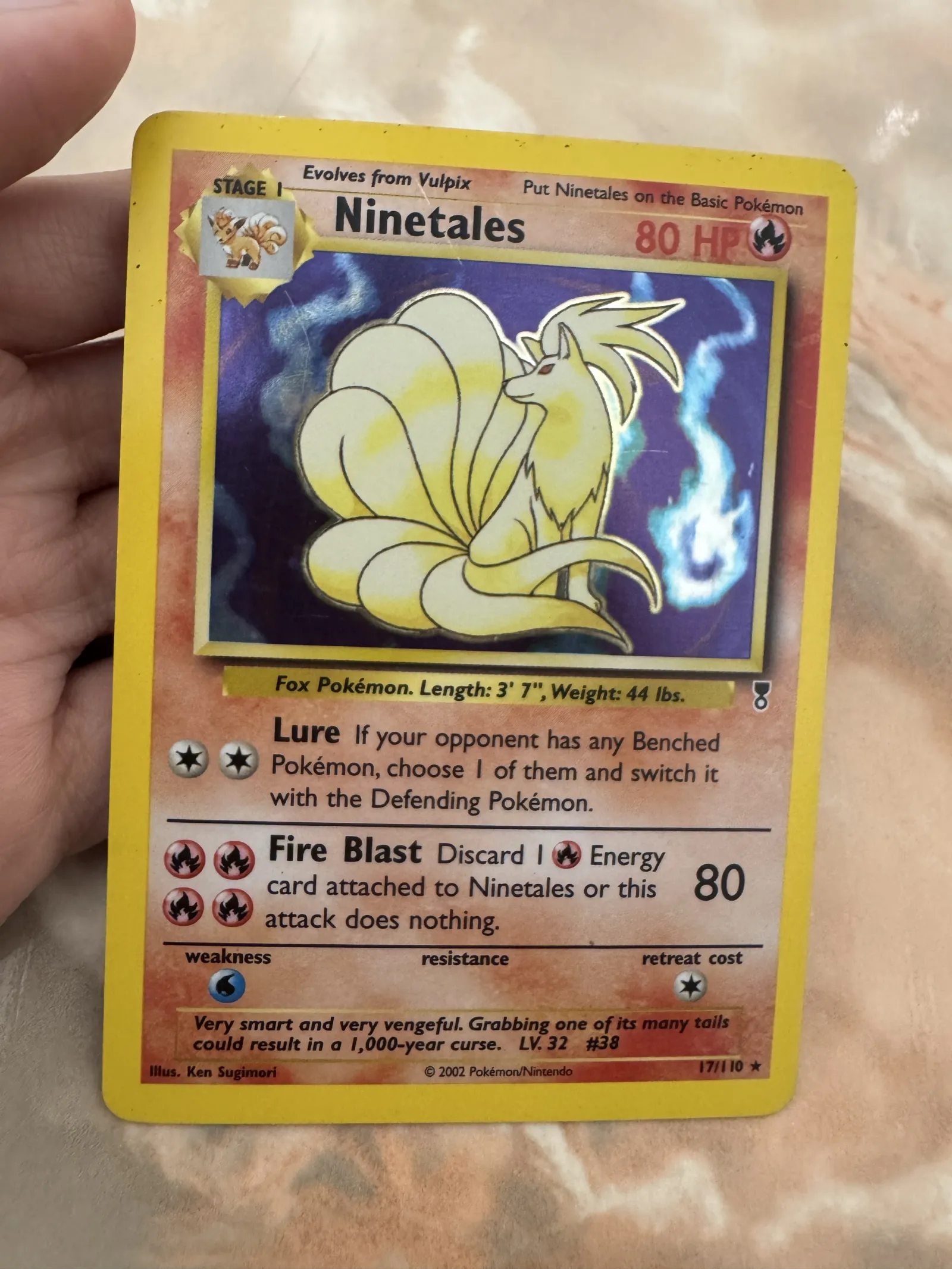 Ninetales card #17 from the FireRed & LeafGreen set (2002), illustrated by Ken Sugimori. This is a holofoil card featuring 80 HP and the moves Lure and Fire Blast. The card is playable in the Pokemon TCG and is collectible due to its holo treatment.