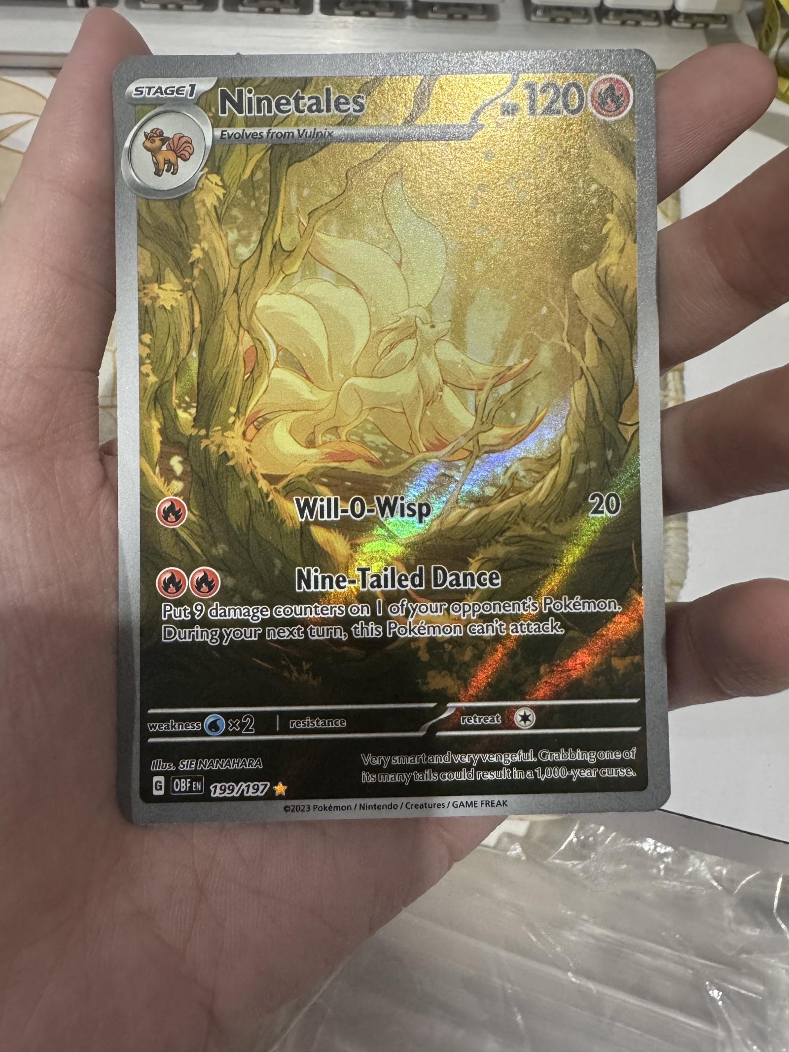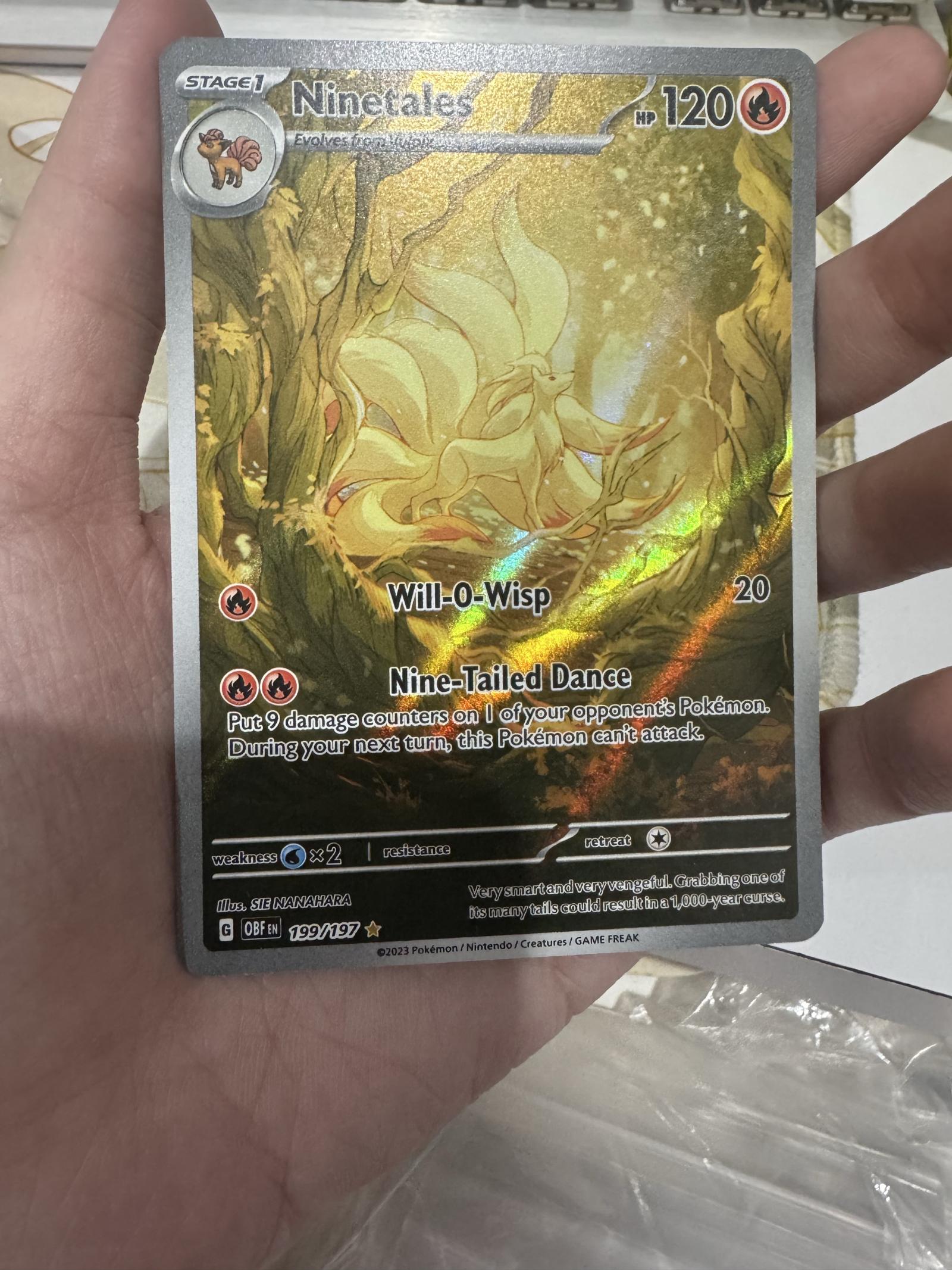 Ninetales from the 2023 Pokémon Scarlet & Violet OB set, card number 199/197. Illustrated by SIE NANAHARA, this is a secret rare gold foil card. The card is playable in the current meta and features the moves Will-O-Wisp and Nine-Tailed Dance. Language: English. This is a highly collectible card due to its secret rare status and gold full-art treatment.