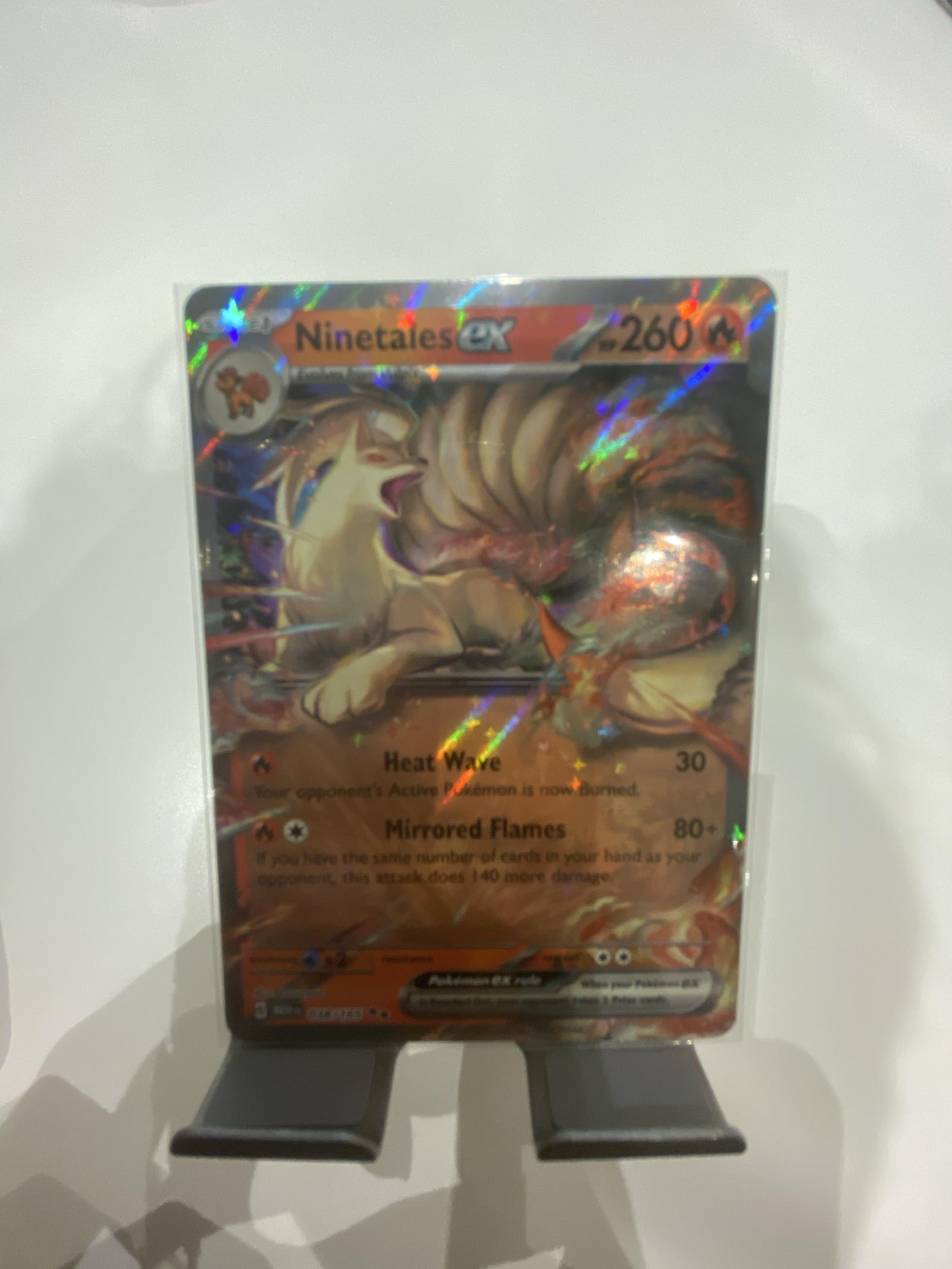 This is a Ninetales EX Pokemon card featuring 260 HP with Heat Wave and Mirrored Flames attacks. The card is holographic with full art, showcasing Ninetales in an action pose. The card is in a protective sleeve and appears to have minimal wear. The back of the card is clear with no visible damage or creases.