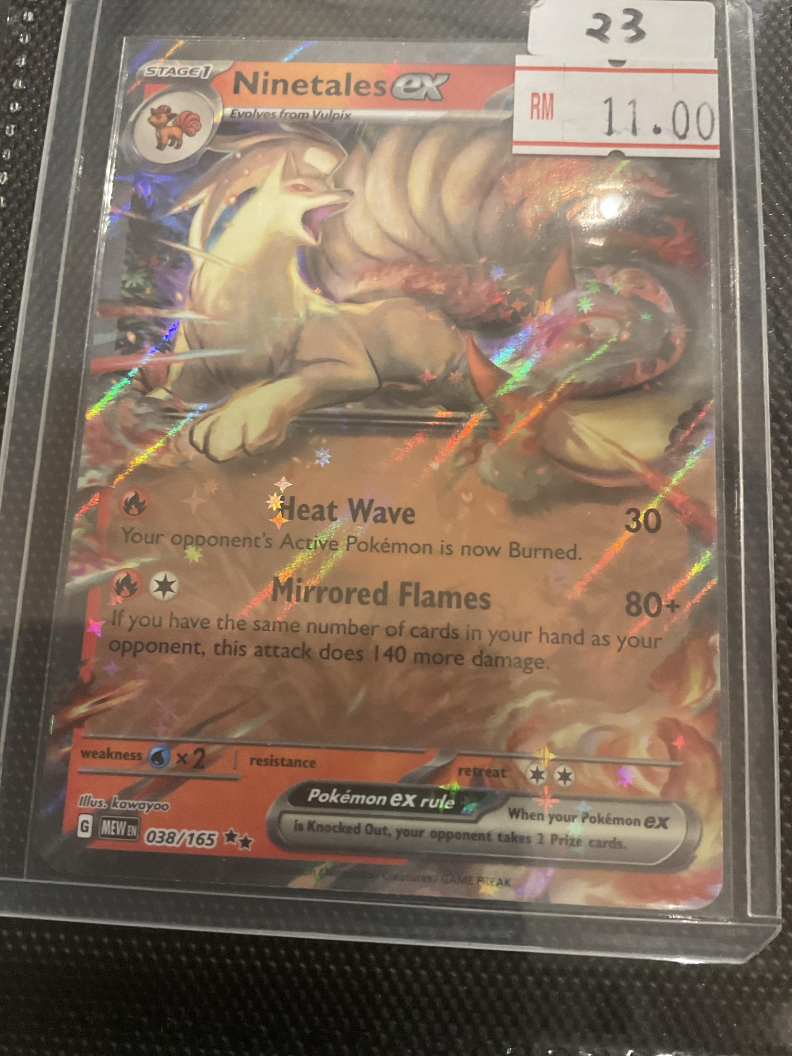 Ninetales ex card illustrated by kawayoo from the Mew set. Card number 038/165. English language holo foil card. Features attacks Heat Wave and Mirrored Flames. Playable in Pokemon TCG and collectible due to holo treatment.