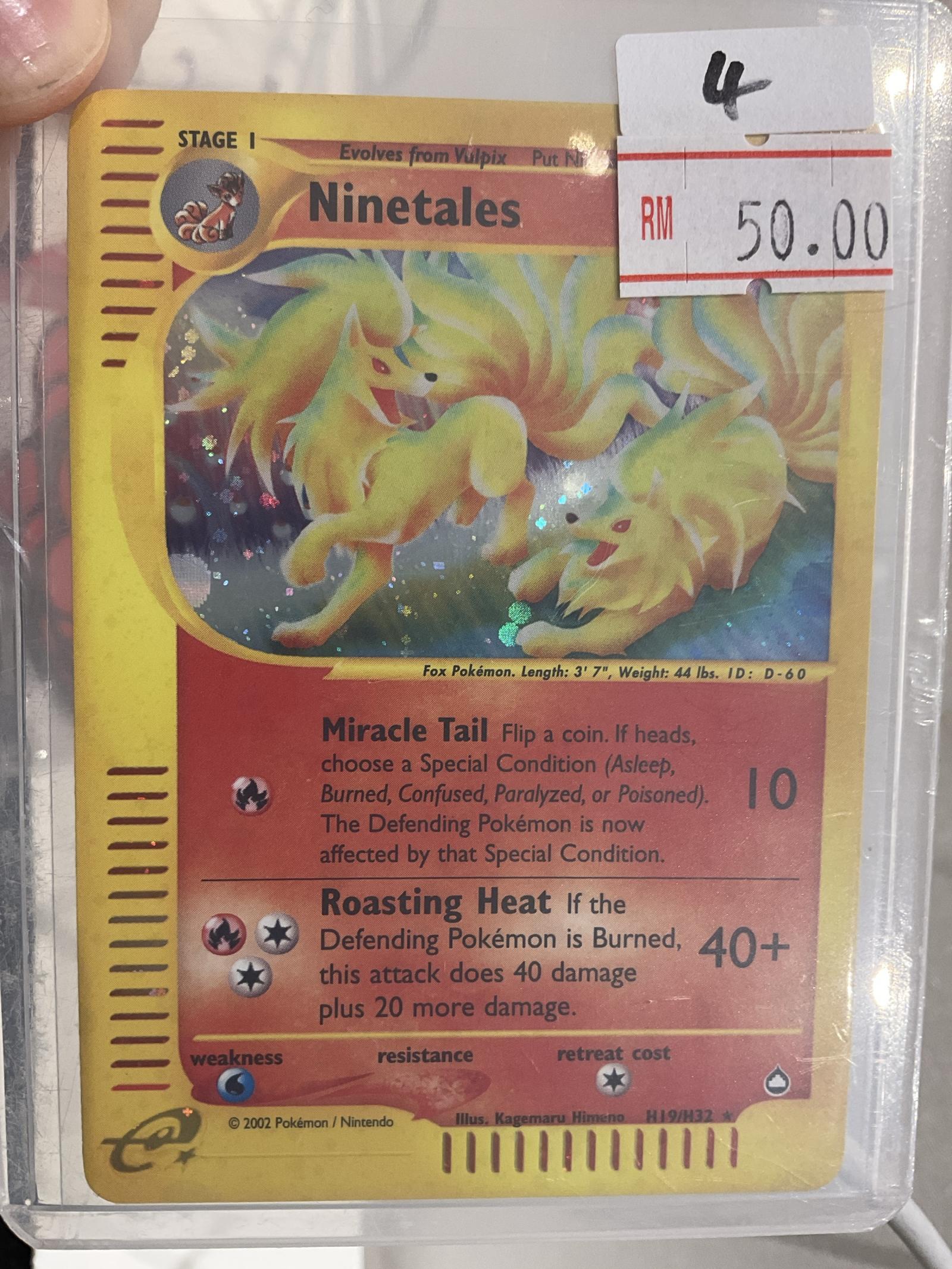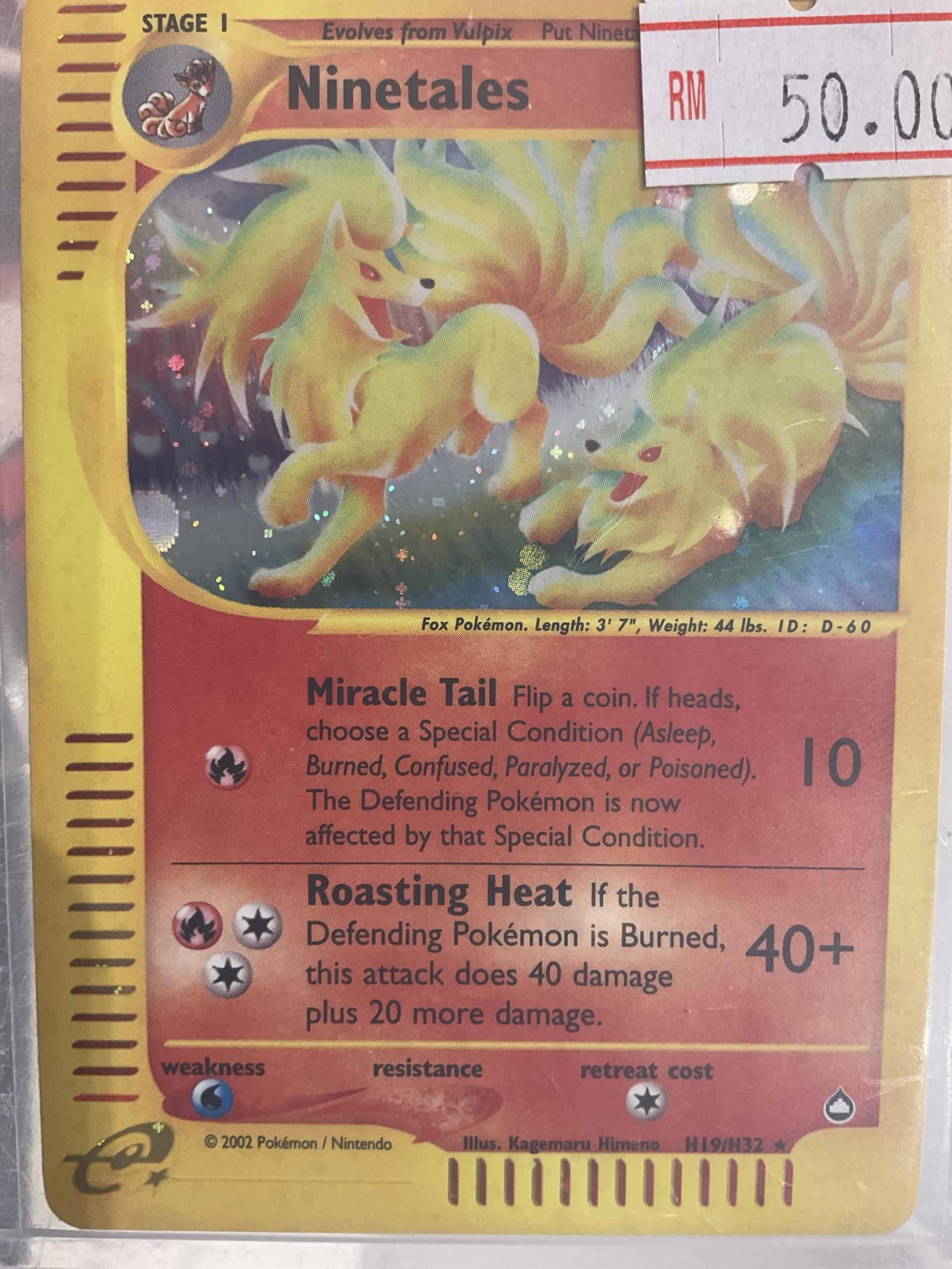 Ninetales card from the Aquapolis set, card number H19/H32. Printed in English. Illustration by Kagemaru Himeno. This is a holo foil card from 2002. The card features attacks Miracle Tail and Roasting Heat. Suitable for collectors and playable in older format decks. Card is protected in a sleeve for preservation.