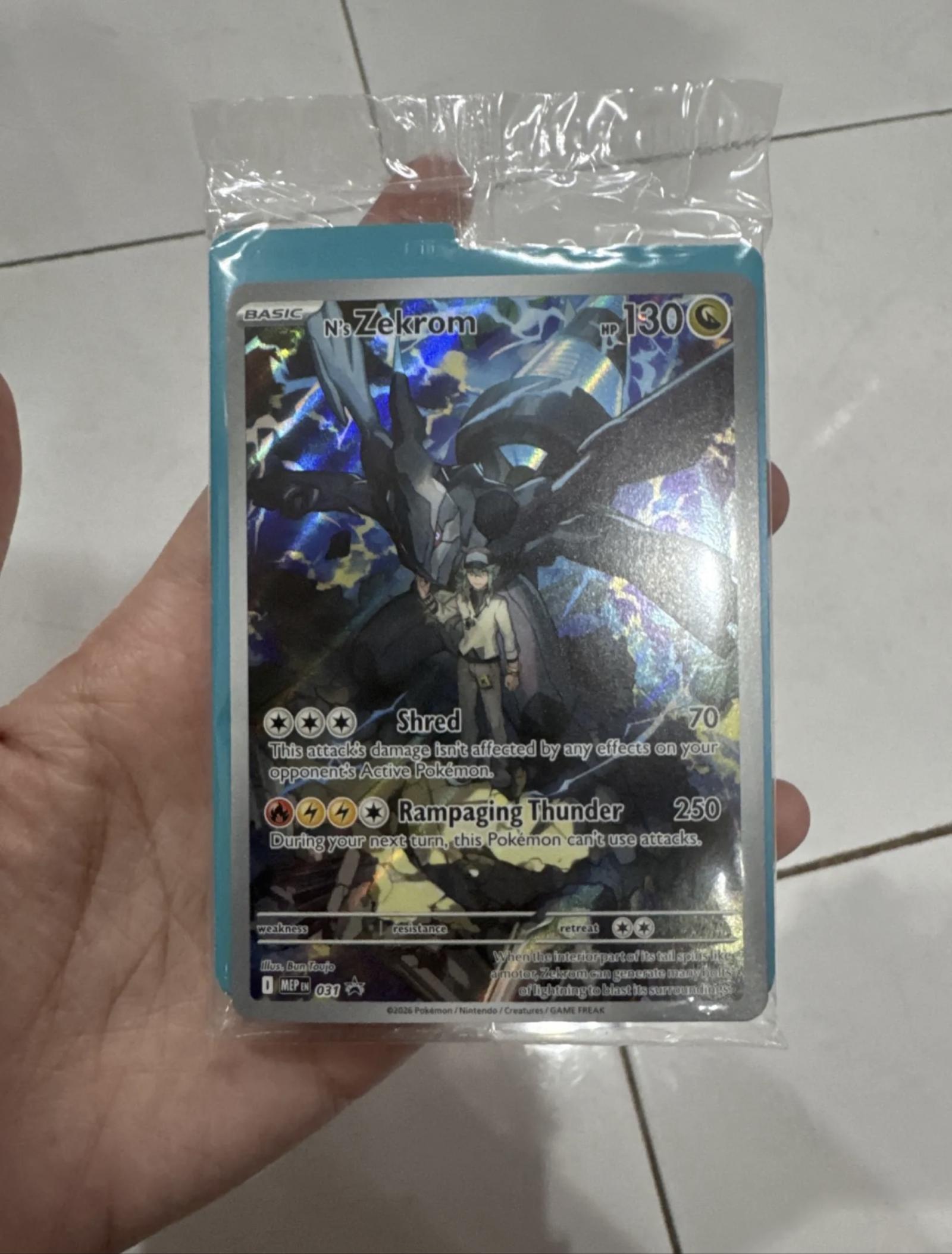 N's Zekrom from the Pokemon TCG set with card code 031/100, illustrated by 5ban Graphics. This holo rare card features powerful attacks Shred and Rampaging Thunder. The card is foil and playable in competitive formats. Collector number: 31. Set code: MEP. Language: English.