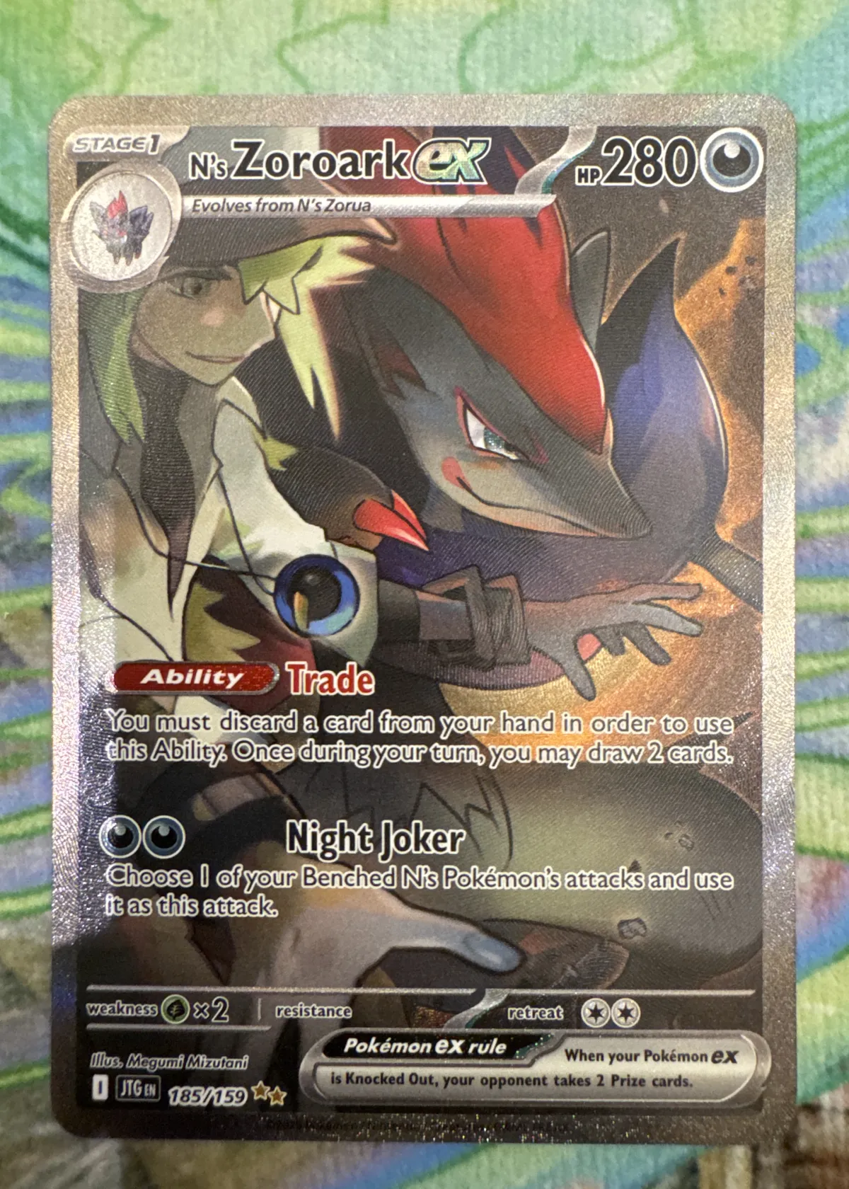 This is a N's Zoroark EX card from the Pokémon TCG, illustrated by Megumi Mizutani. The card number is 185/159 from the set JIG/IN. The card features abilities such as 'Trade' and the attack 'Night Joker.' This version is a secret rare, as indicated by its numbering beyond the set total. It is also a holofoil card. The card's 6-digit code, if available, should be present on the card but is not clearly visible in the image. It is in English language. N's Zoroark EX is primarily collectible due to its rarity and special artwork. This card does not appear legal for tournament play as it is a custom promo.