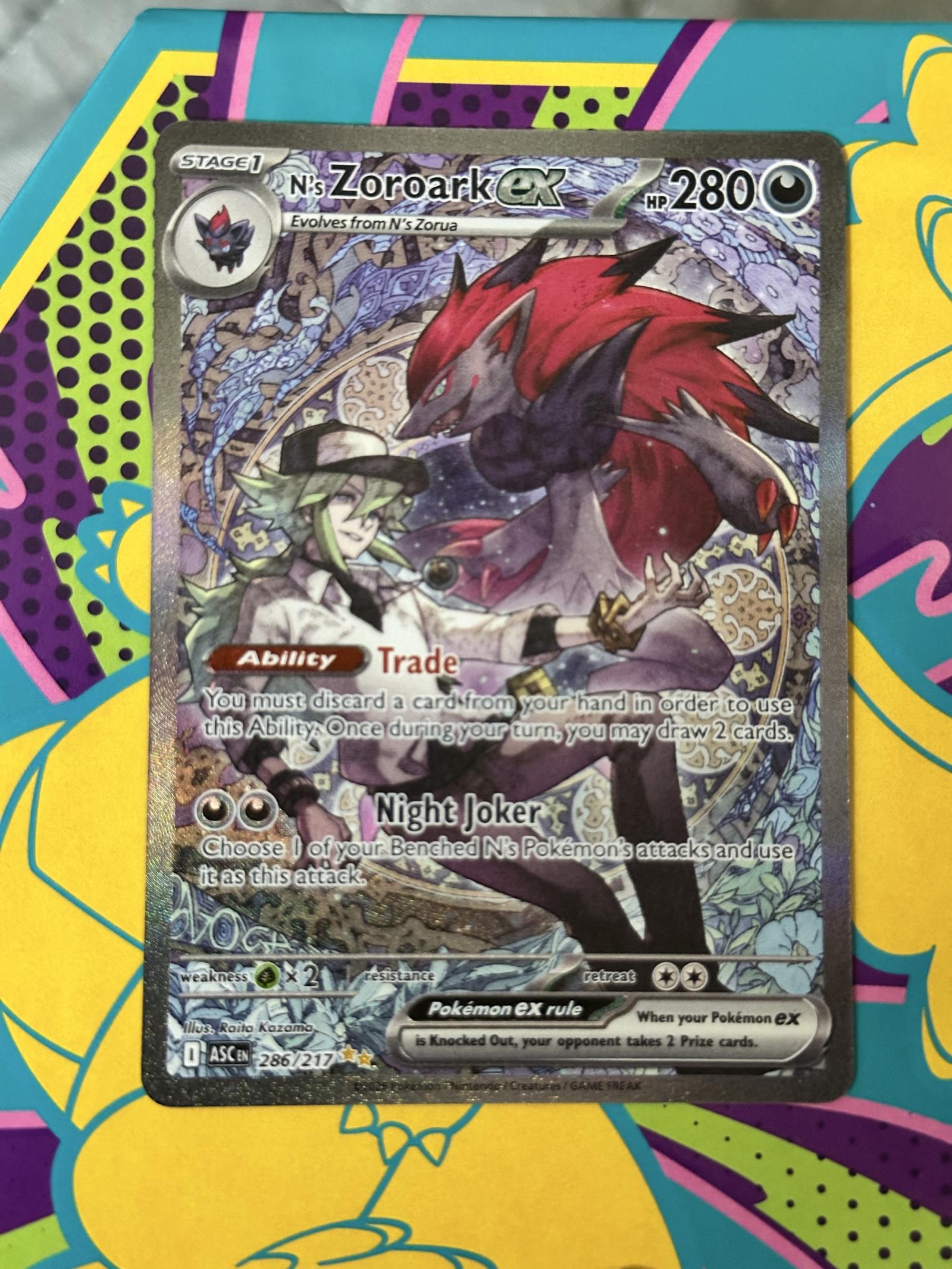 N's Zoroark EX from the ASC set, card number 286/217, illustrated by Runo Kazama. English language. This is a full art promo card with a shiny foil treatment. Playable in Pokemon TCG meta with useful ability 'Trade' and attack 'Night Joker'. Card code: 286/217. Collector number 286. Special secret rare card due to numbering and full art style.