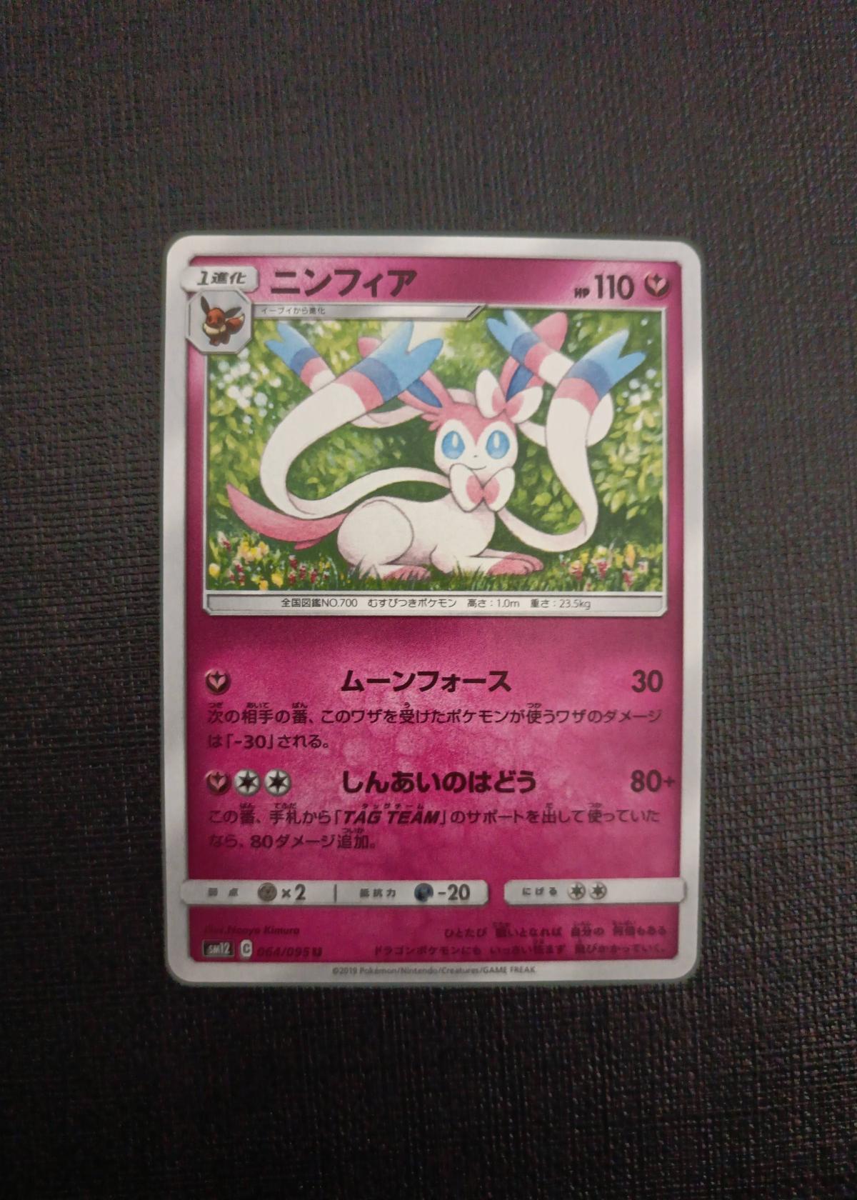 Pokemon TCG Japanese Sylveon card, illustrated by Hasuno Kimura, from the SM12 set (TAG TEAM GX All Stars). The card number is 64/95, and the six-digit card code printed is sm12. This is a non-foil, regular printing. The card is more collectible than meta-relevant due to the set age and rotation.