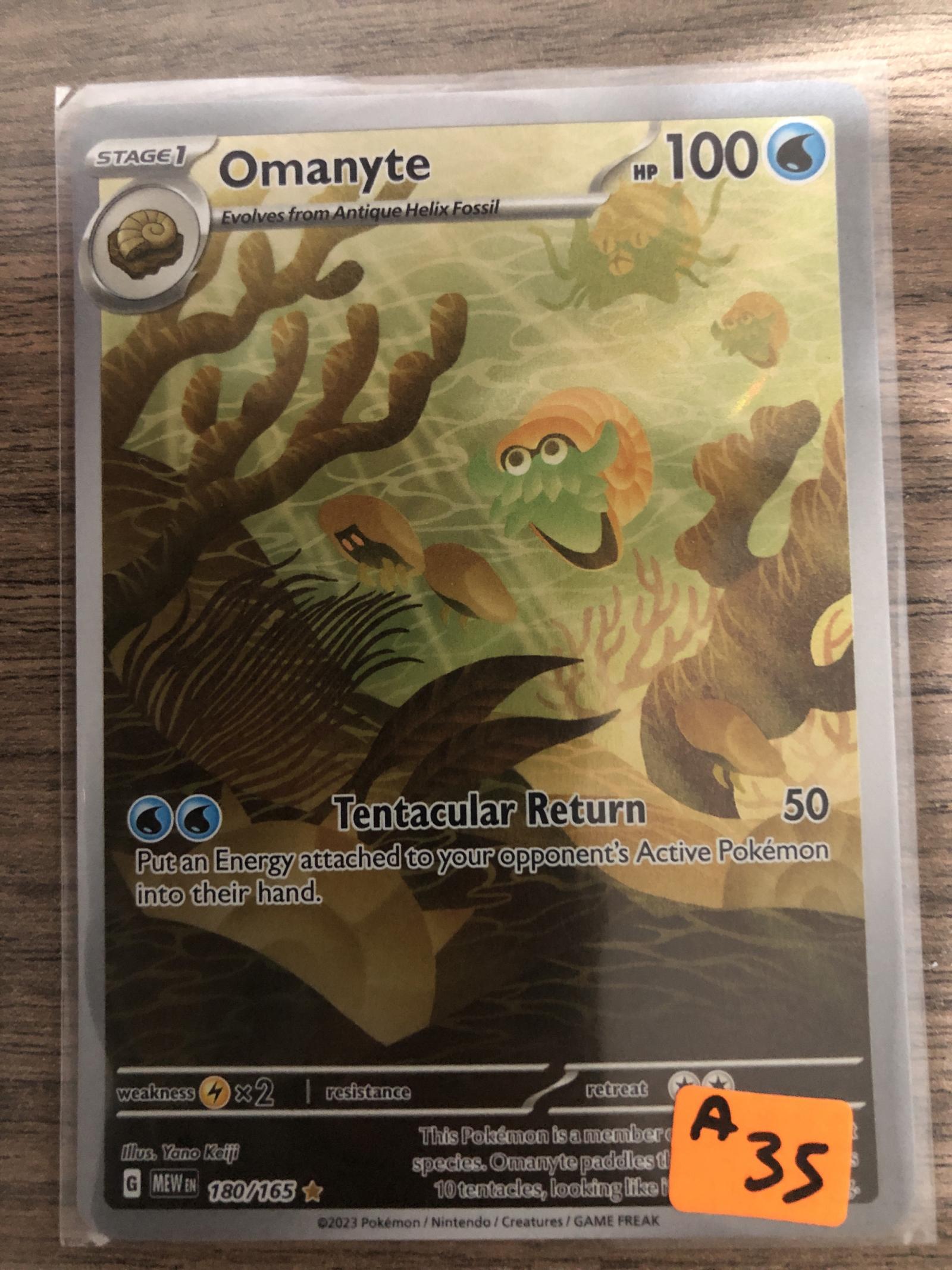 Omanyte full art holo card from the MEW EN set with card number 180/165. Illustrated by Yano Keiji. This is a foil card considered collectible and slightly playable. Card features the Tentacular Return attack with HP 100. Published 2023 by Pokémon/Nintendo/Creatures/GAME FREAK.