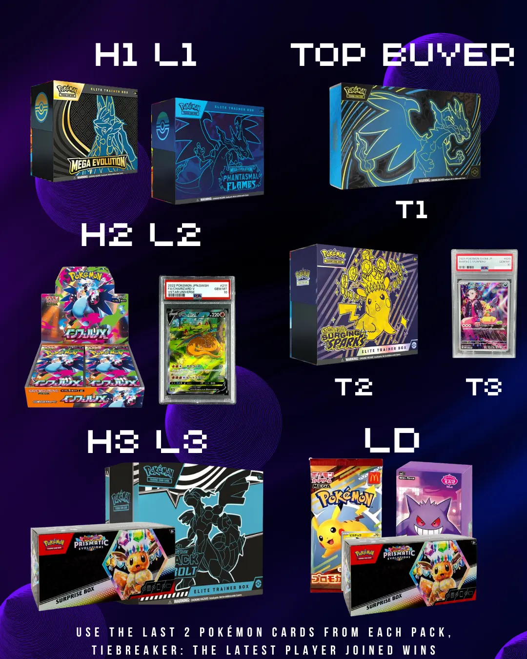 Pull the highest/lowest HP and win insane prizes 🎁🔥 🥇 H1 / L1: Mega Evolution Lucario , Mega Charizard ETB 🥈 H2 / L2 / M2: Booster Box & Charizard V PSA 10 🥉 H3 / L3: Prismatic Evolutions Surprise Box & Black Bolt ETB
