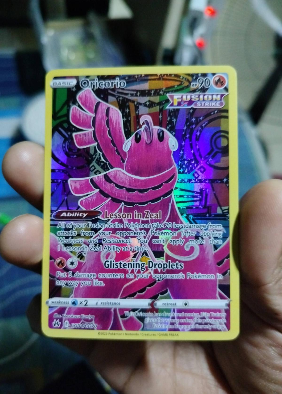 This is an Oricorio card from the Pokémon TCG Fusion Strike set, featuring the Fusion Strike logo and the unique card code GG04/GG70. The artwork is by Tomokazu Komiya. This card has a holographic (holo) treatment and is numbered 4 in its subset. The ability 'Lesson in Zeal' and attack 'Glistening Droplets' make it playable in Fusion Strike decks and recognized for its support role in the current meta. The card is not graded or slabbed. Special features include its vibrant, eye-catching holofoil and collectible potential.