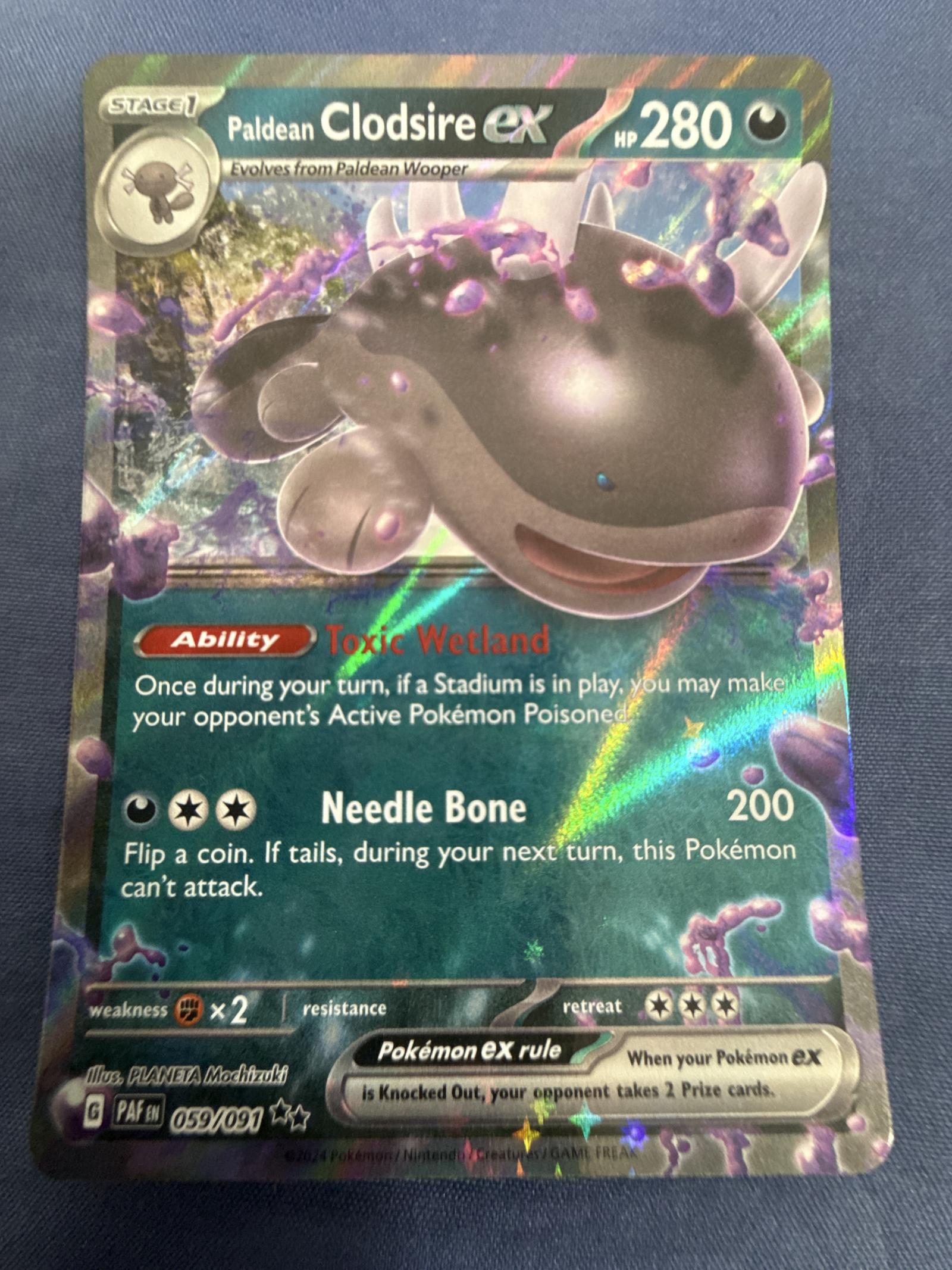 Paldean Clodsire ex card from the Pokemon TCG set with collector number 059/091. Illustrated by PLANETA Mochizuki. This holo card features the Ability 'Toxic Wetland' and attack 'Needle Bone'. Playable card in the Pokemon TCG meta. Language code 'EN'.