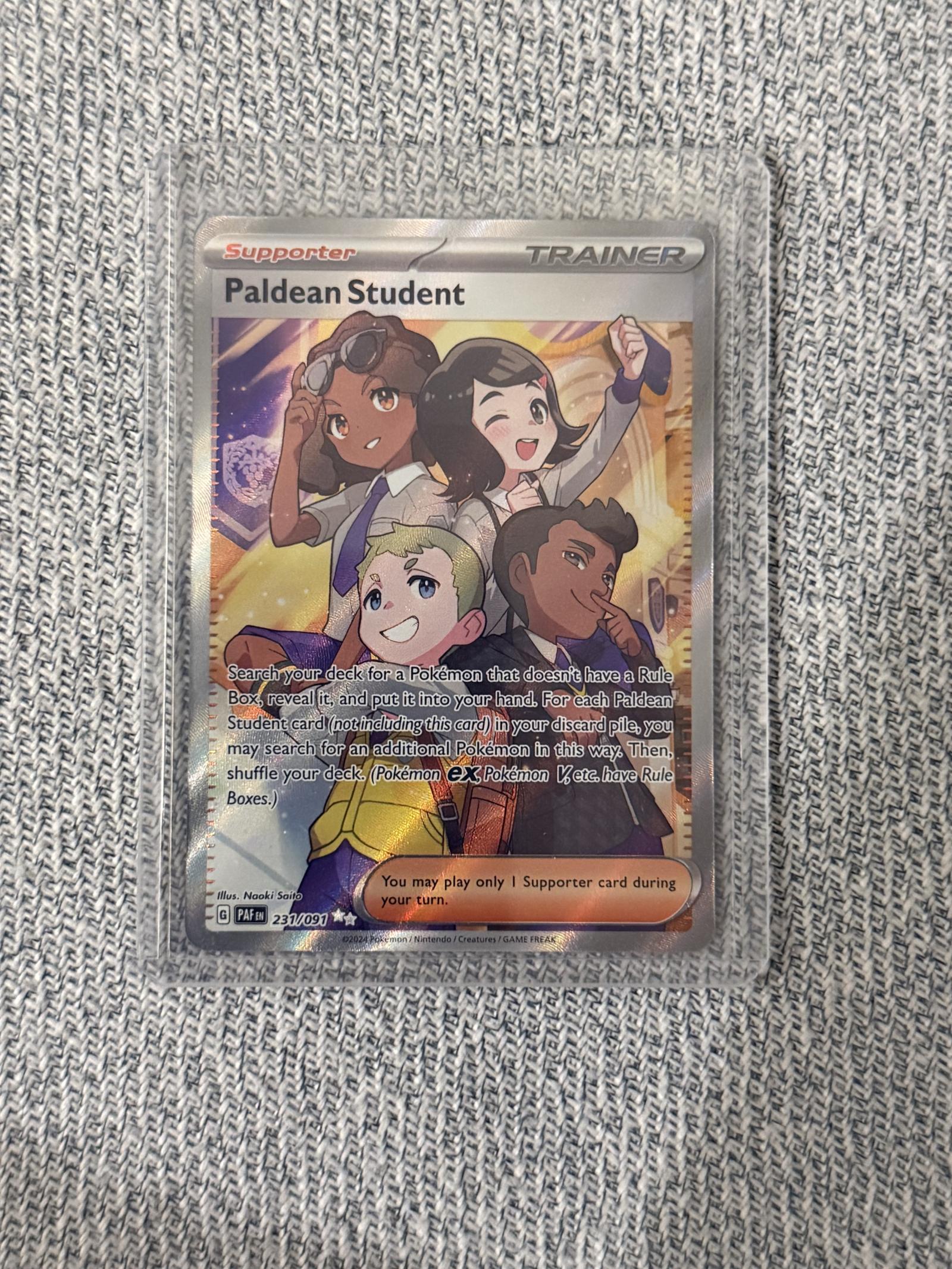 Paldean Student Trainer card from the Pokemon Scarlet & Violet Paldean Allied Forces (PAFin) set. Card number 231/091. Illustrated by Naoki Saito. This is a full art foil card. The card is playable in the meta as a Supporter card useful for deck searching Pokémon without a Rule Box. Card code 231091. Language code English.