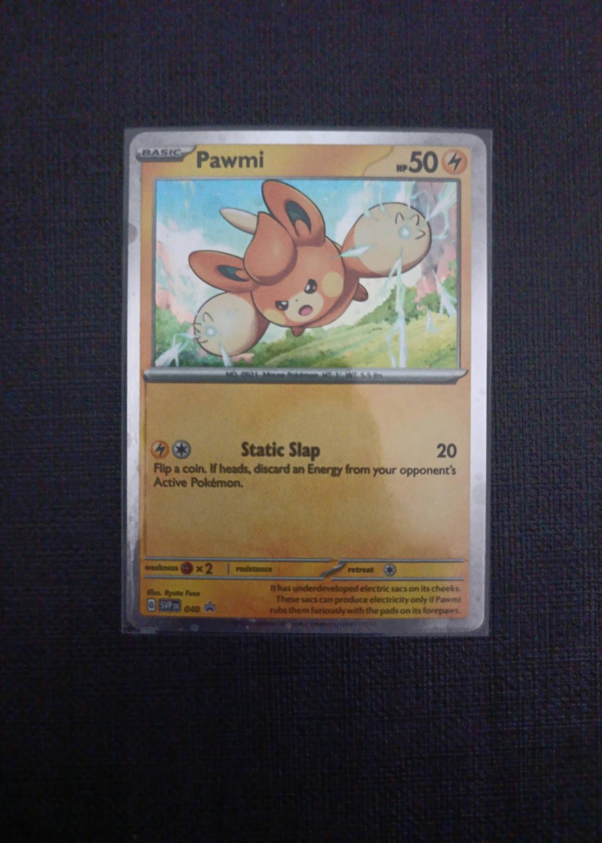 This is a Pawmi card from the Pokemon TCG Scarlet & Violet Promo set. Collector number 40 from the SVP set. The card features artwork by Ryota Fuse (illustrator credit on card). The 6-digit card code is not available. This is a non-foil, regular card and is suitable for play in the current Pokemon TCG meta as a basic Electric-type Pokémon. This card is primarily considered collectible unless it fits into certain deck strategies. Not graded.