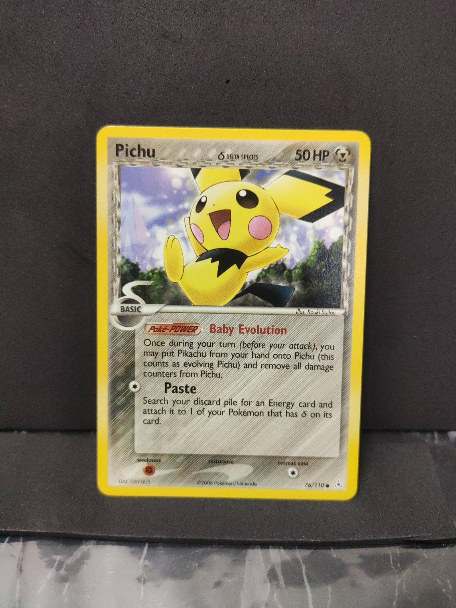 Pichu from the Delta Species set (2006), card number 76/110. Illustrated by Kouki Saitou. Features the Baby Evolution Poké-Power and Paste attack. This card is a non-foil, English printing. Playable in decks featuring Delta Species Pokémon, making it competitive in relevant builds.