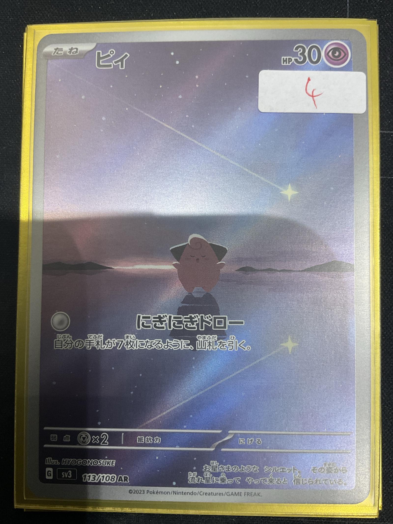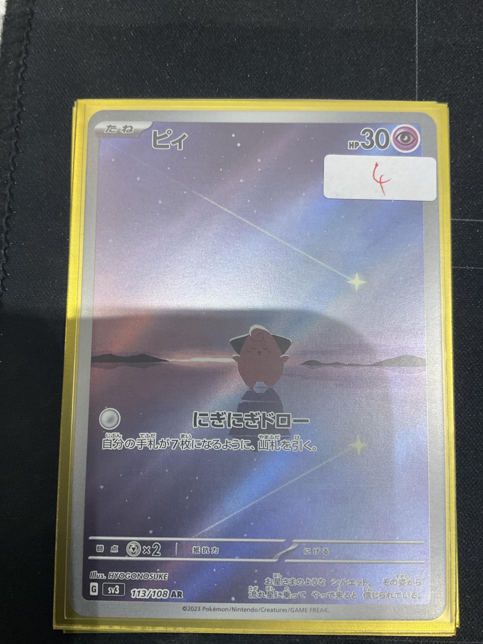 Japanese Pii card from the Scarlet & Violet (SV3) set, card number 113/108 AR. Illustrated by HYOGONOSUKE. This card features alternate rare (AR) holo treatment. Part of the 2023 Pokémon/Nintendo/Creatures/GAME FREAK series. Playable in Pokémon TCG but generally collected for rarity and artwork.