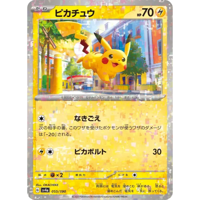 A Japanese Pikachu card (card number 055/190) from the Sword & Shield Promo set (set code sv4a). Illustrated by OKACHEKE, this card features 70 HP and is a normal printing with no foil. The card is collectible and can be used in the Pokémon TCG gameplay. Card code 055/190. Language: Japanese.