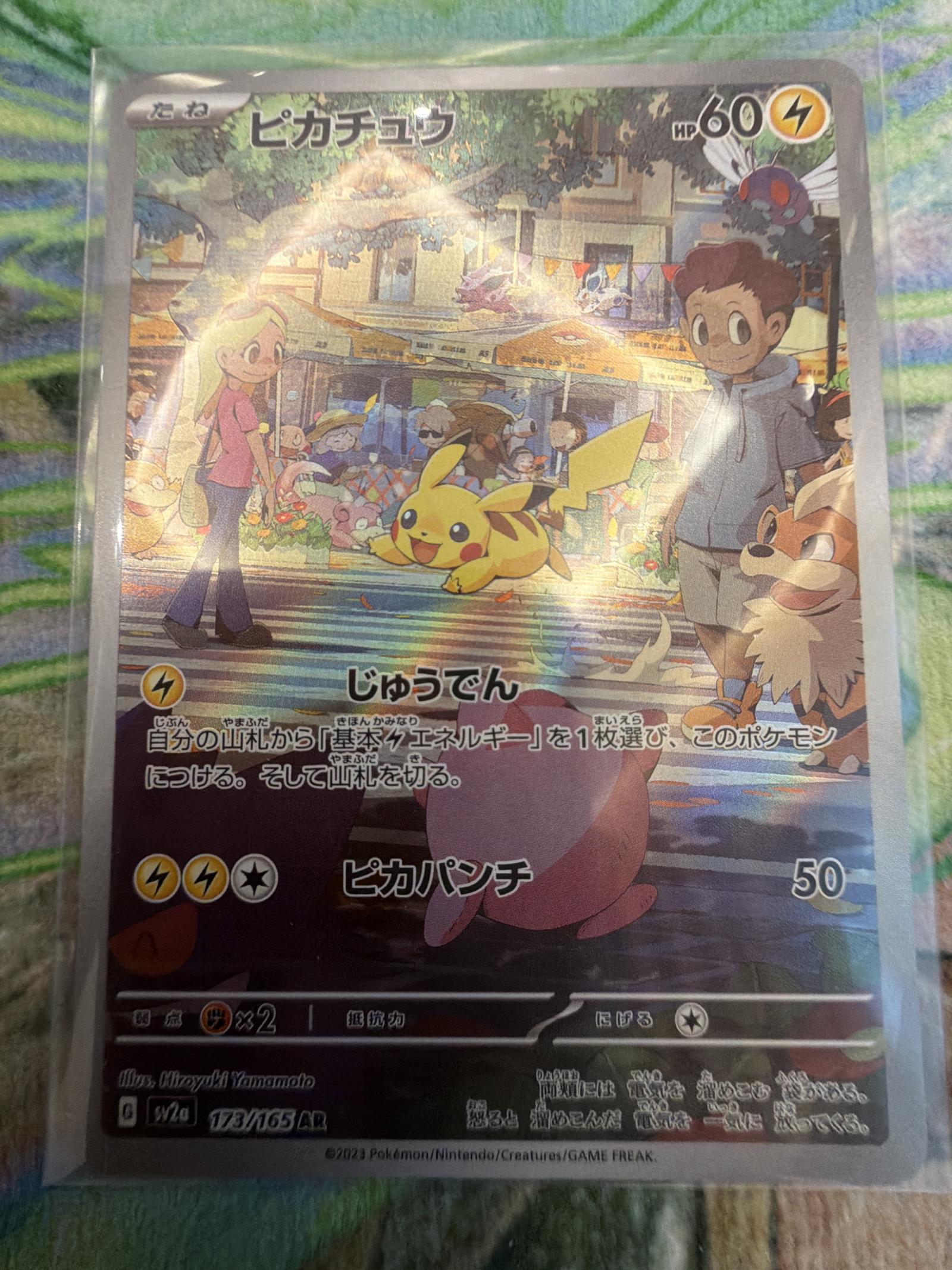 Pikachu card from the Japanese Sword & Shield 7a set, collector number 173/165. Artist: 5ban Graphics. This is an alternate rare (AR) card with a full-art foil treatment. Card code: 060/073. The card is in Japanese language. Part of the 2023 set released by Pokemon/Nintendo/Creatures/GAME FREAK. This card is collectible and may be playable depending on the current meta.
