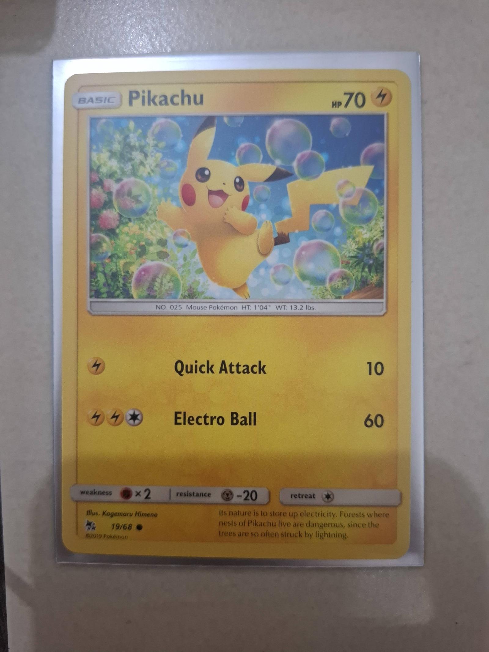 Pikachu card from the 2019 Sun & Moon Promo set, card number 19/68, illustrated by Kagemaru Himeno. This card features Quick Attack and Electro Ball moves. It is a non-foil collectible and playable in meta decks. Language is English.