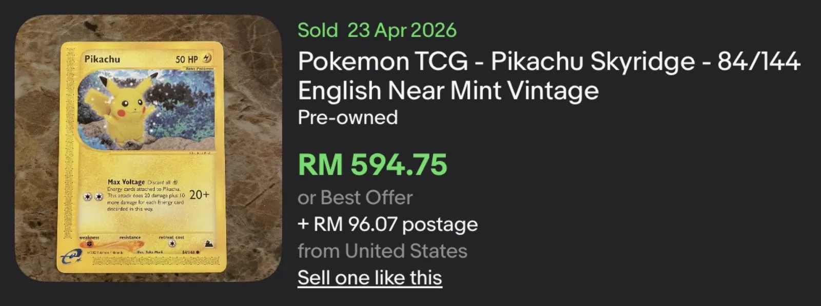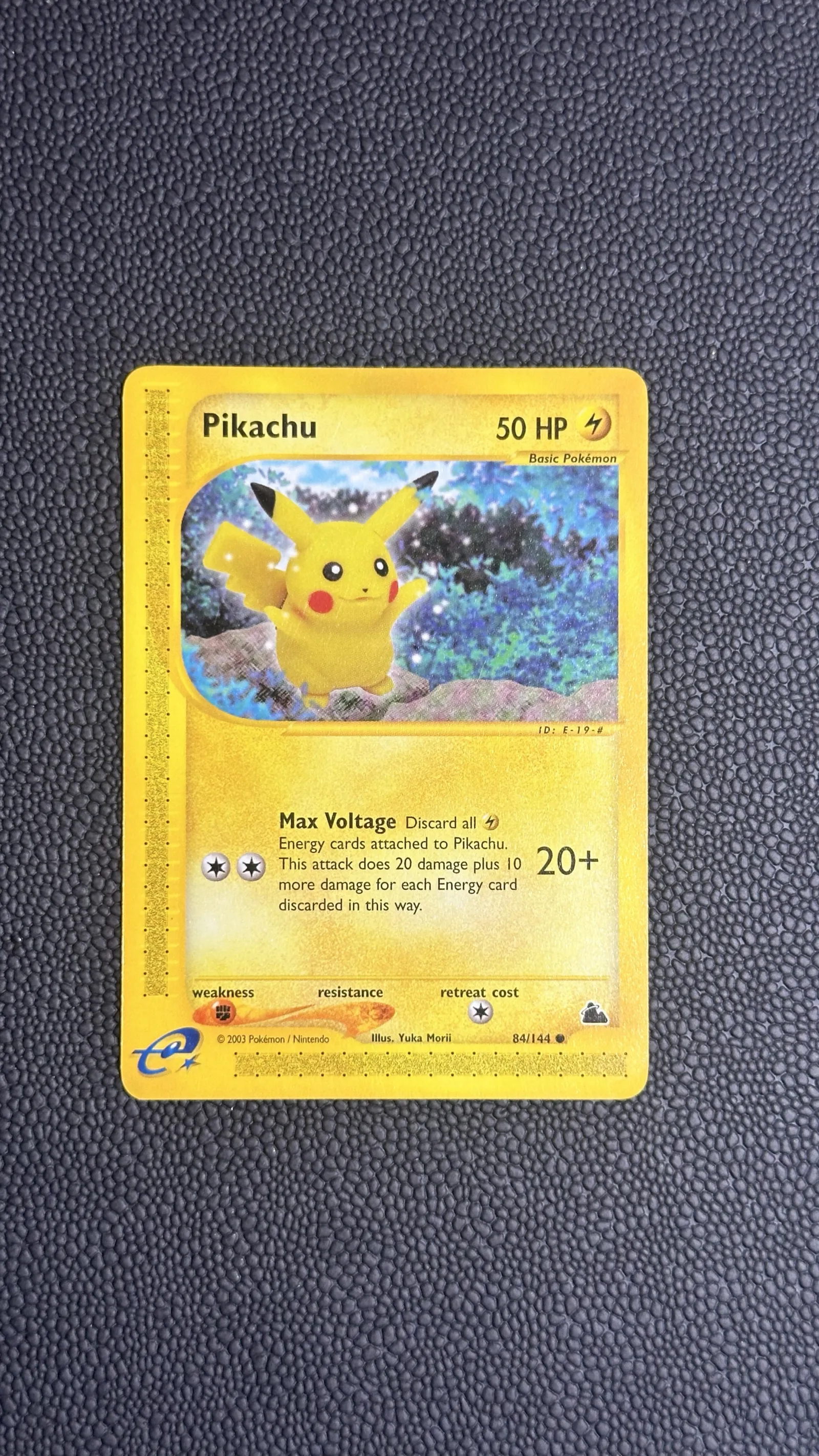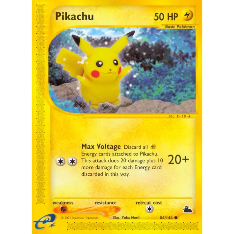 Pikachu card from the e-Reader set, card number 84/144. Illustrated by Yuka Morii, released in 2003 by Nintendo. This is a holographic card featuring the Max Voltage attack. Suitable for collecting; has moderate playability in older formats. The card is in English and has a normal printing treatment.