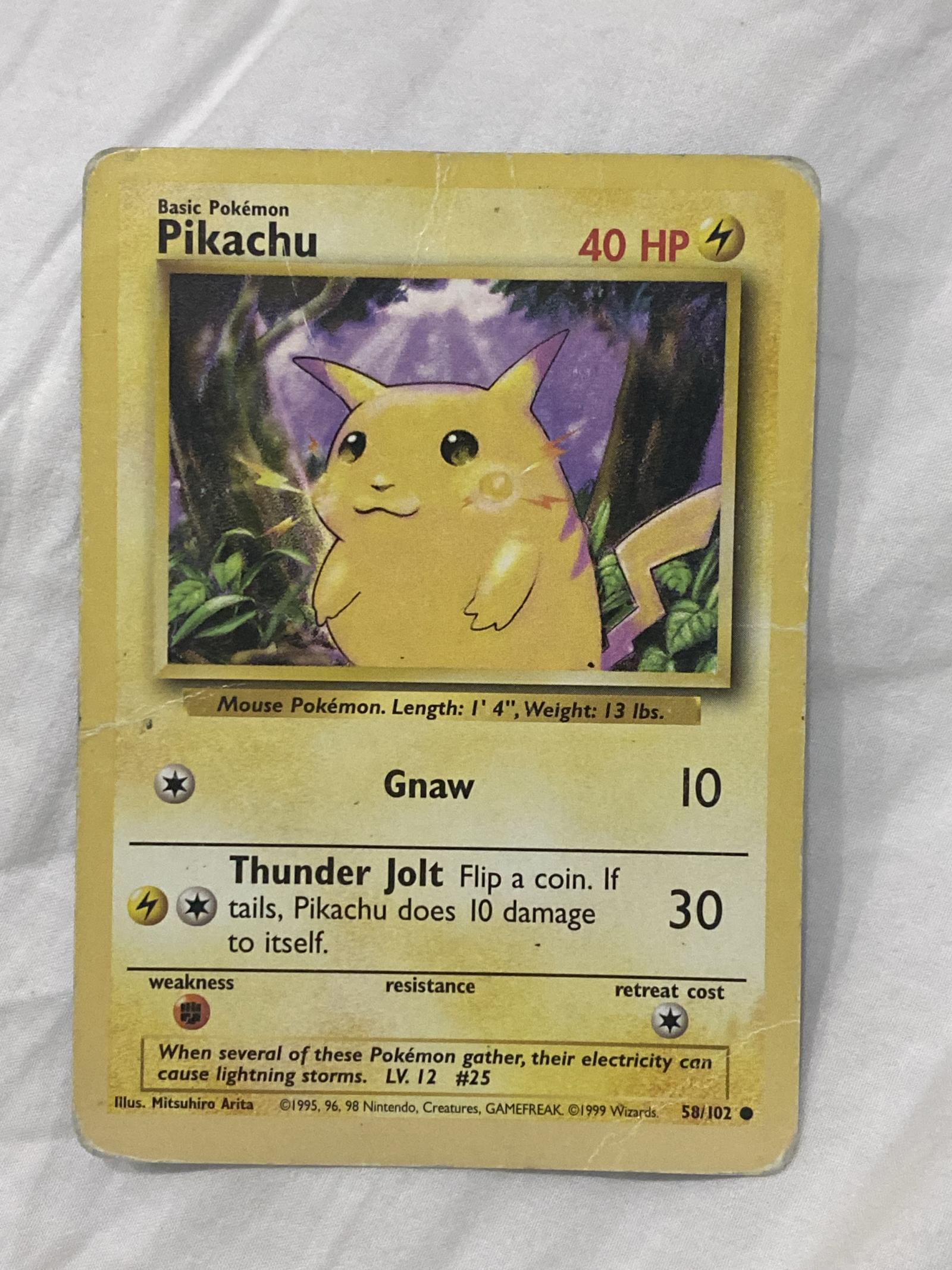 Pikachu card from the English Base Set 2(set code 102) with collector number 58. Illustrated by Mitsuhiro Arita. This card features 40 HP and attacks Gnaw and Thunder Jolt. It is a normal non-foil card from the classic 1999 Wizards of the Coast release. While nostalgic and collectible, it has limited playability in the modern competitive meta. Card shows visible wear and edge damage, affecting its grade and collector value.