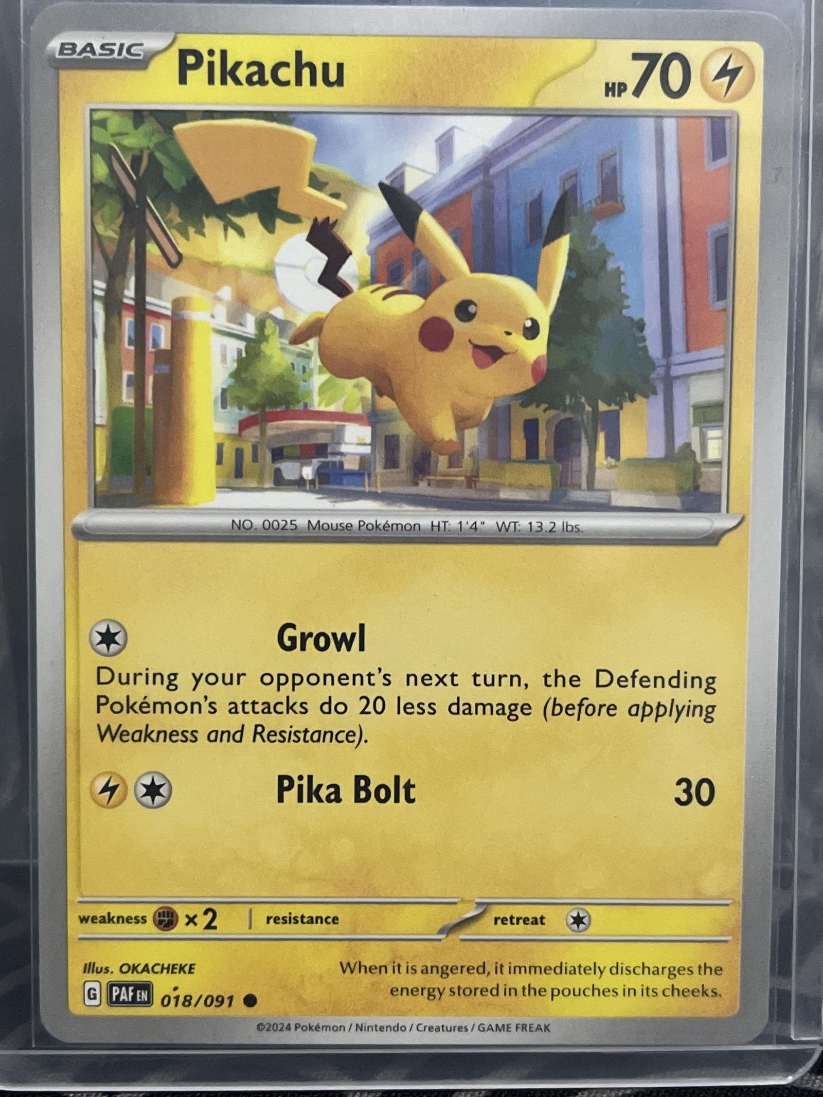 Pikachu card number 18 out of 91 from the Scarlet & Violet PAF set. Illustrated by OKACHEKE. Language: English. This card has no foil treatment. It's a basic Pokémon with 70 HP featuring the moves Growl and Pika Bolt. A collectible card suitable for fans and moderate competitive play. Card code: 018/091.