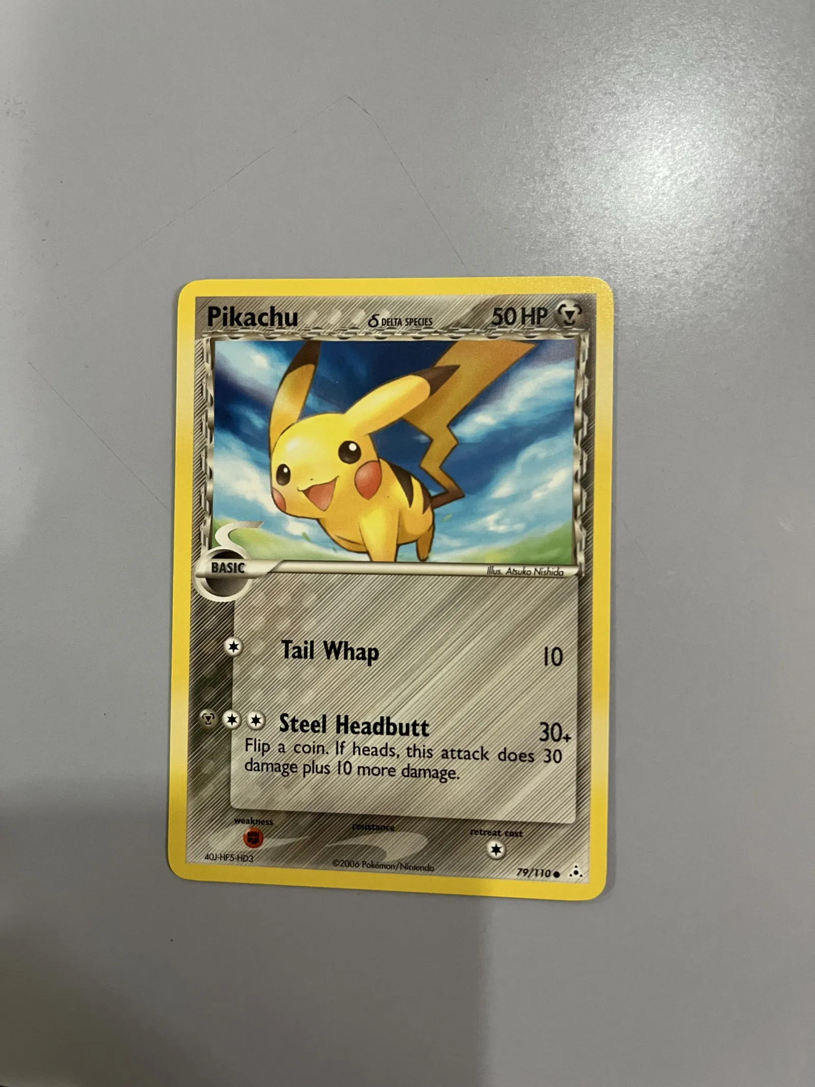 As a Delta Species card, this Pikachu is given an unusual typing instead of its normal Electric type, which is part of the experimental “Holon” theme where Pokémon were altered with different energies.