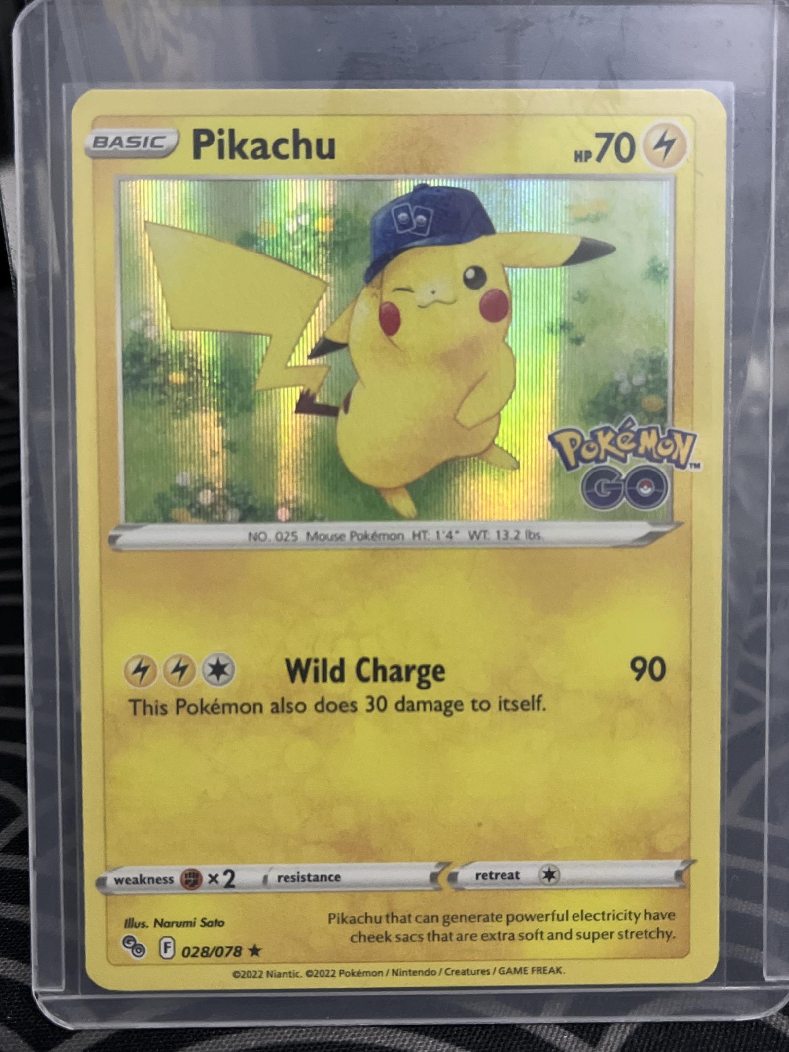 This is a Holo Pikachu card (#028/078) from the Pokemon GO set, illustrated by Narumi Sato. The card was released in 2022. Pikachu has 70 HP and the attack Wild Charge. It's a collectible holo promo card, playable in casual and some meta decks. The card features the Pokemon GO logo and a special hat design on Pikachu.