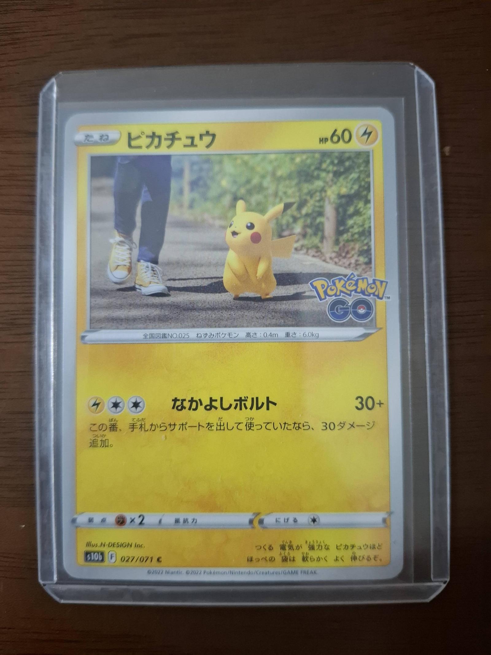 Pikachu card from the Pokémon GO set (s10b), card number 027/071. Japanese language. Illustrator: N-DESIGN Inc. The card is holographic foil and features a photo-realistic style of Pikachu walking on a path. It is collectible and can be used in casual play but is not known as a top meta playable card.