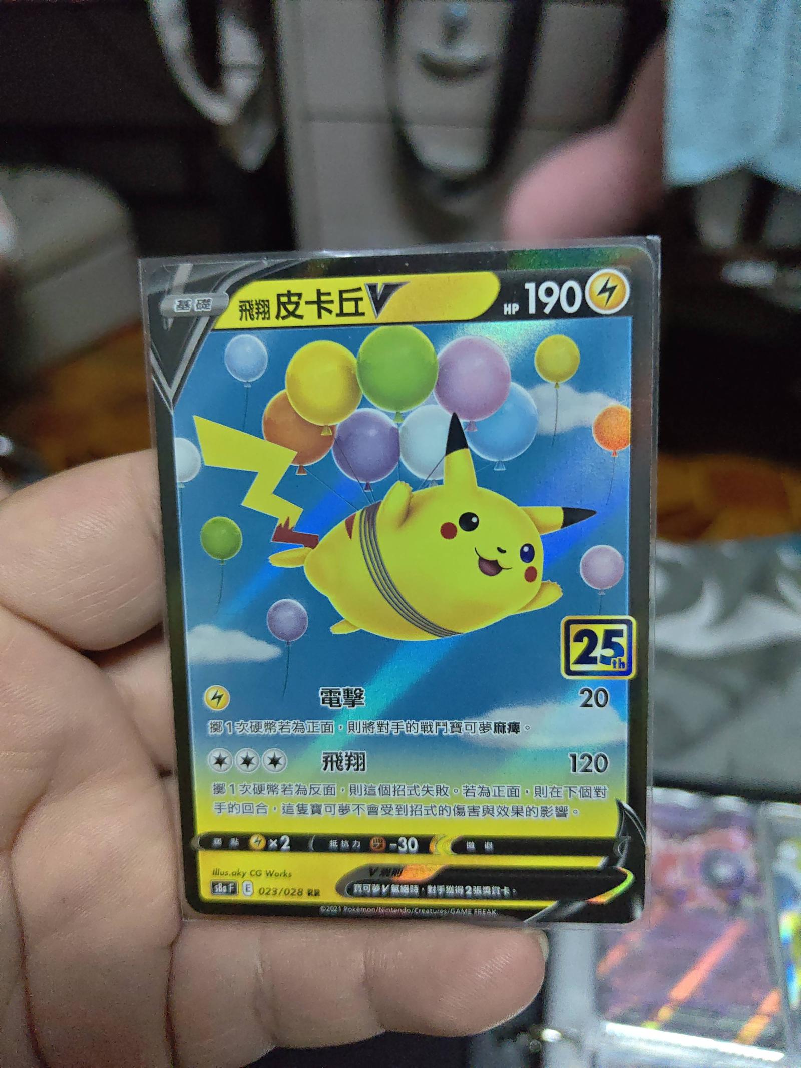 Pikachu V from the 25th Anniversary set, card number 023/028, illustrated by sky CG Works. This card is a holographic promo printed in Traditional Chinese (Taiwan). A special collectible card celebrating Pokemon's 25th anniversary with a colorful balloon design. Playable in meta as a V card.