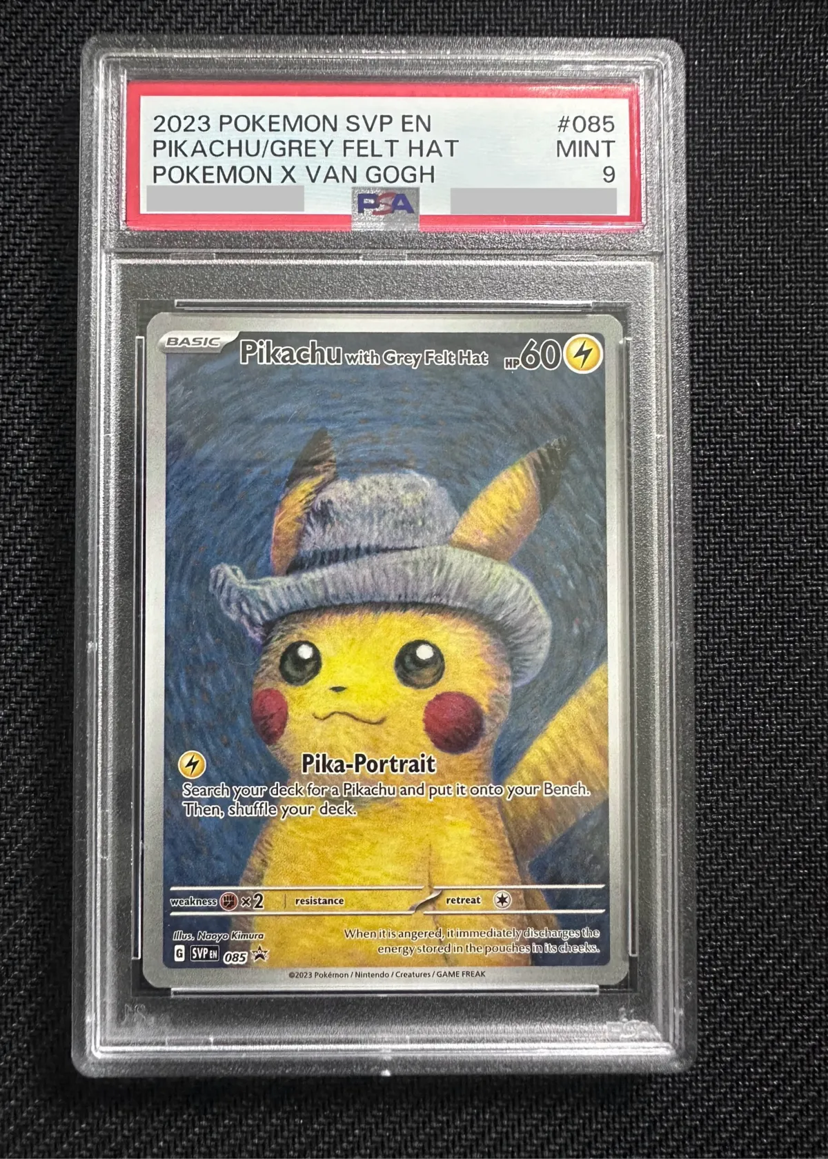 This is a graded Pokémon TCG card: Pikachu with Grey Felt Hat from the special Pokemon x Van Gogh Museum promo collaboration. Card number is 85/SVP, set code SVP, English language. The card features a unique artwork inspired by Van Gogh and was released as a highly collectible promotional item in 2023. The card is graded PSA 9 (Mint), confirming its high quality. Collector code: SVP085. Artist: Naoyo Kimura. Set name: SVP Black Star Promo. This card is non-foil and primarily collectible due to its limited release and unique art, rather than meta playability.
