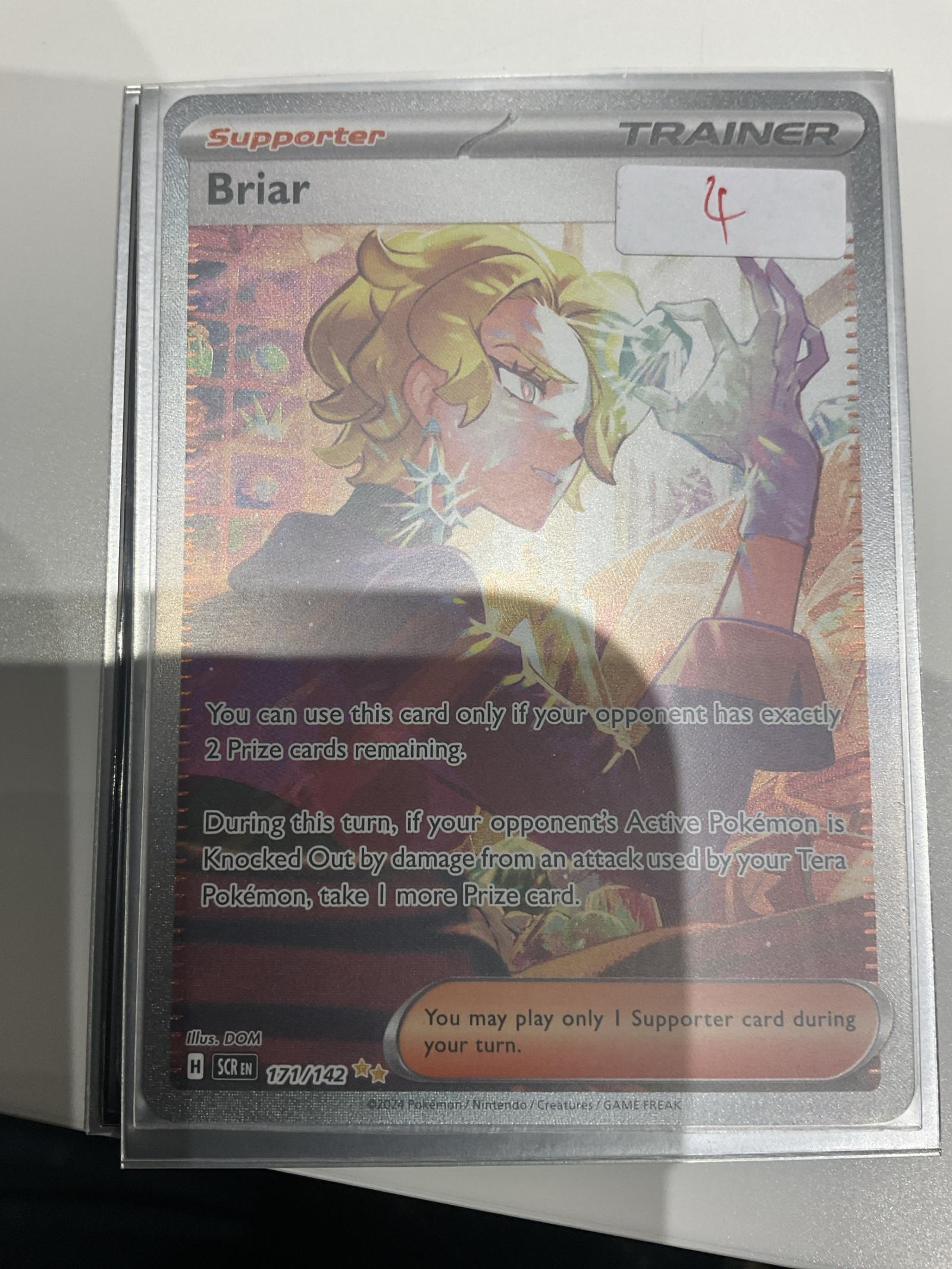 Briar Trainer Supporter card from the Evolving Skies set. Card number 171/142, Secret Rare holofoil. Illustrated by DOM. Playable in the current meta as a strategic card when your opponent has exactly 2 Prize cards left. English language. Foil surface with secret rare printing treatment.