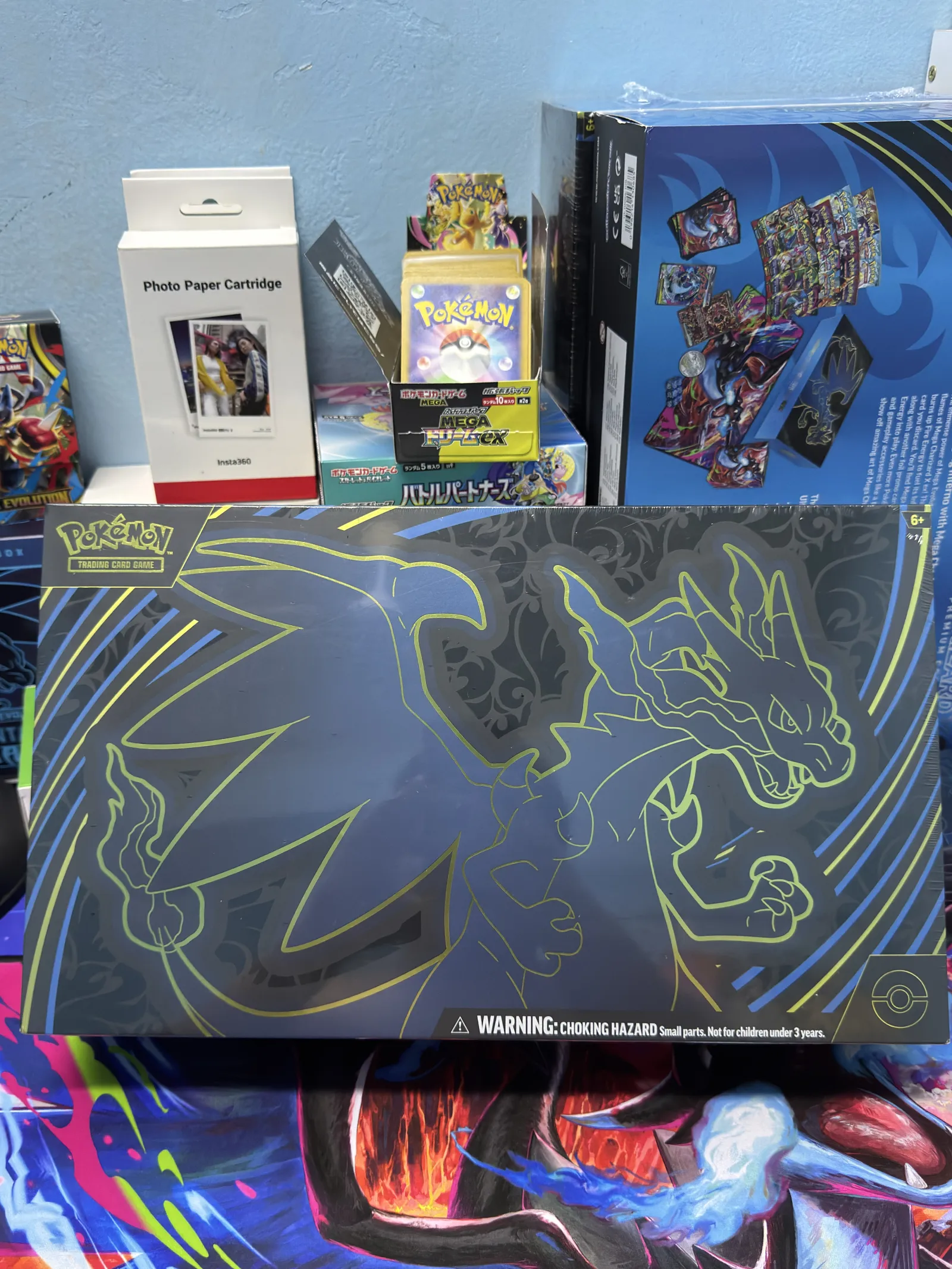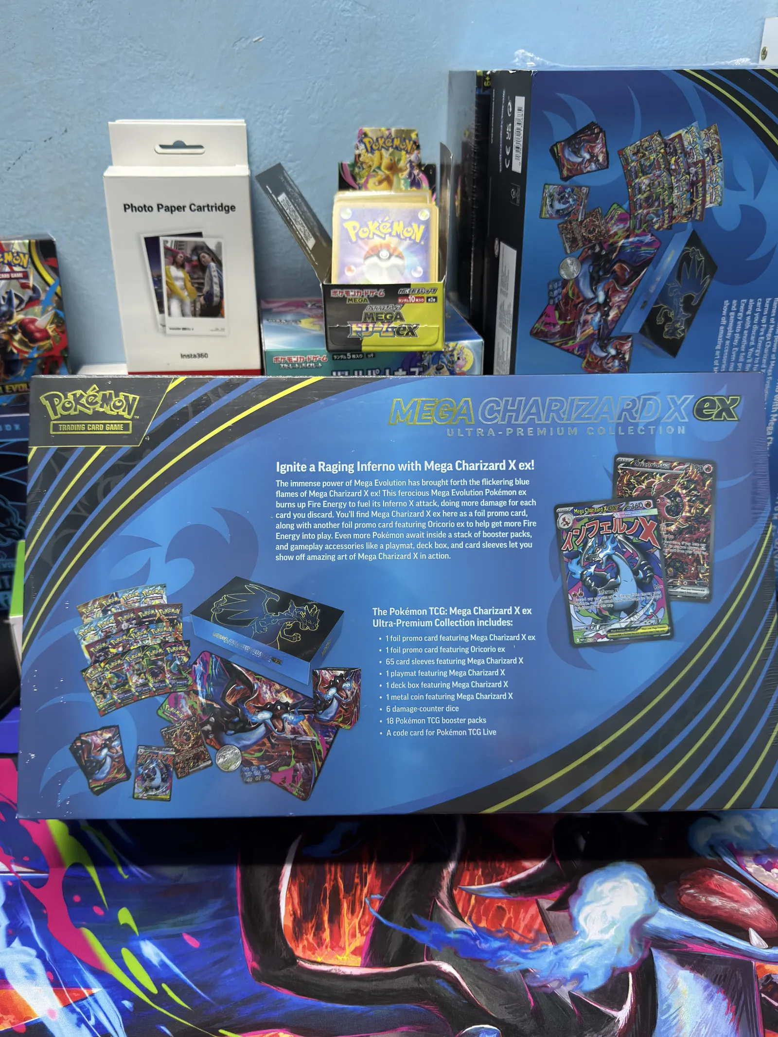The Pokémon TCG: Mega Charizard X ex Ultra-Premium Collection includes: • 1 foil promo card featuring Mega Charizard X ex • 1 foil promo card featuring Oricorio ex • 65 card sleeves featuring Mega Charizard X • 1 playmat featuring Mega Charizard X • 1 deck box featuring Mega Charizard X • 1 metal coin featuring Mega Charizard X • 6 damage-counter dice • 18 Pokémon TCG booster packs • A code card for Pokémon TCG Live
