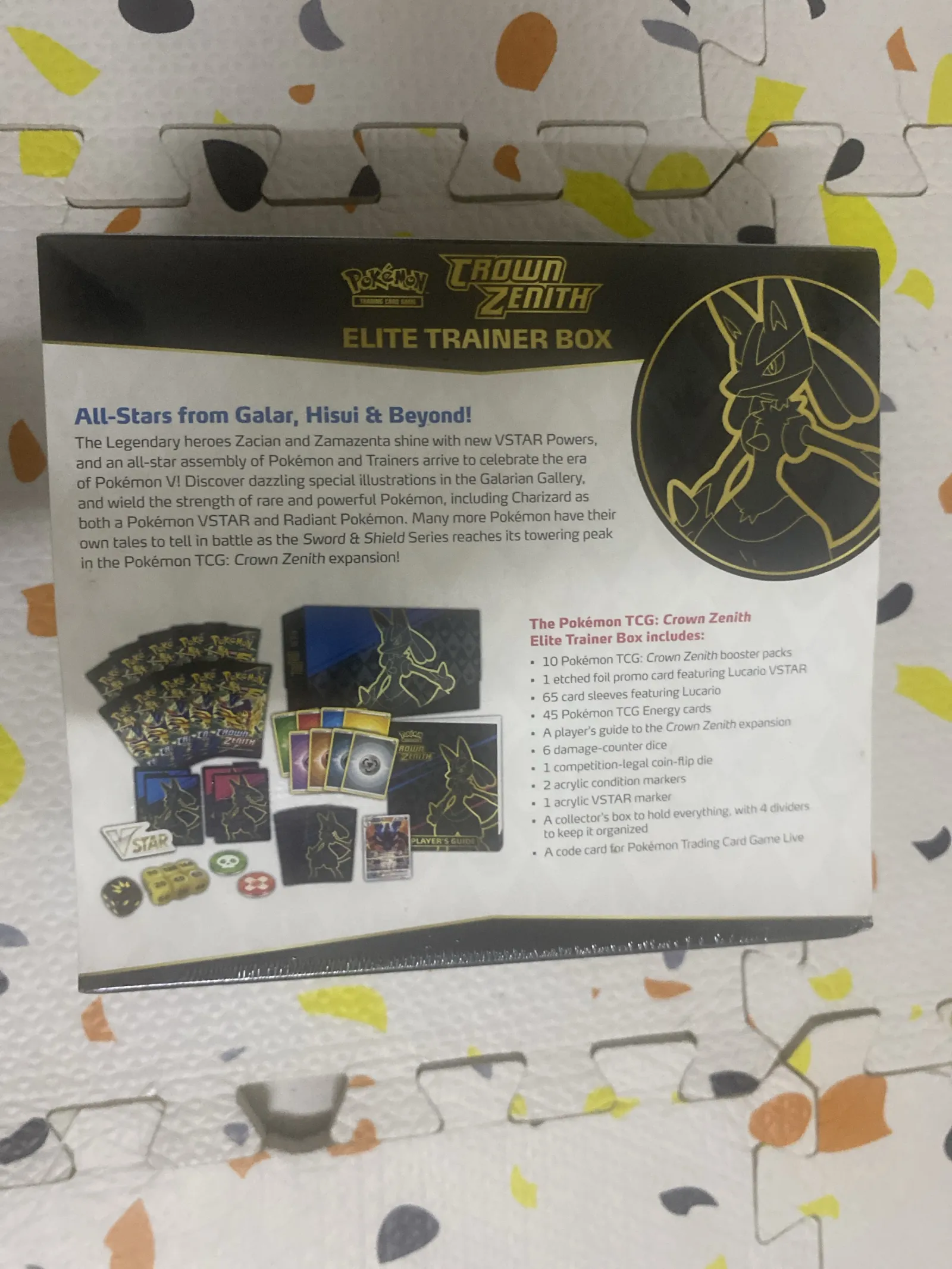 Contents and notable features: includes the official etched-foil promo card featuring Lucario VSTAR (as listed on the back), 10 Crown Zenith booster packs, 65 illustrated Lucario card sleeves, 45 energy cards, a player’s guide to the Crown Zenith expansion, a collector’s box with 4 dividers, 6 damage-counter dice, 1 competition-legal coin-flip die, 2 acrylic condition markers, 1 acrylic VSTAR marker, and a code card for Pokémon TCG Live. All accessories are the themed Lucario design shown on the packaging.
