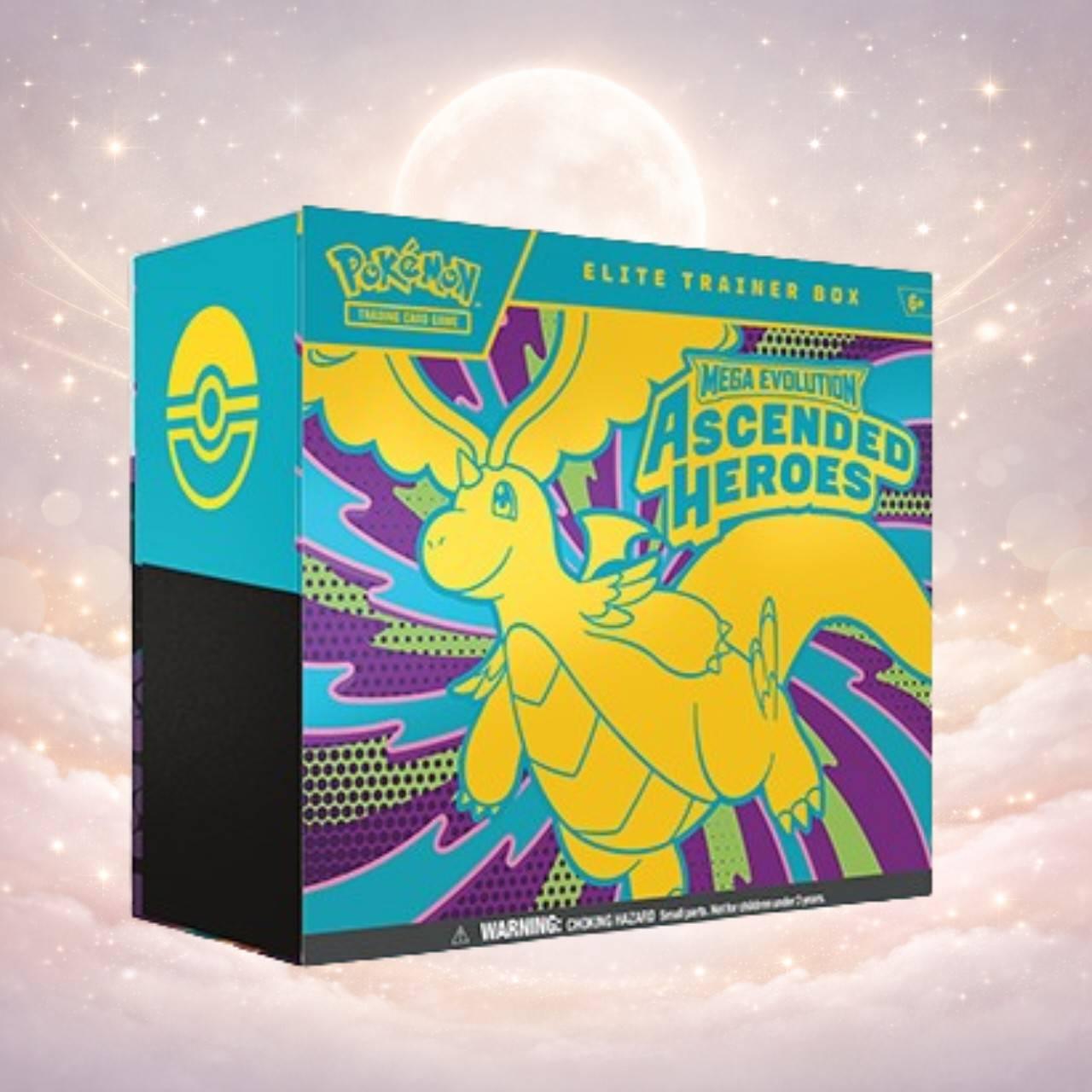 Elite Trainer Box from the Ascended Heroes set titled 'Mega Evolution Ascended Heroes.' This box contains cards and accessories for Pokémon TCG play and collecting. It is part of the popular Mega Evolution series. Suitable for both play and collection. No specific card, artist, or foil information provided.