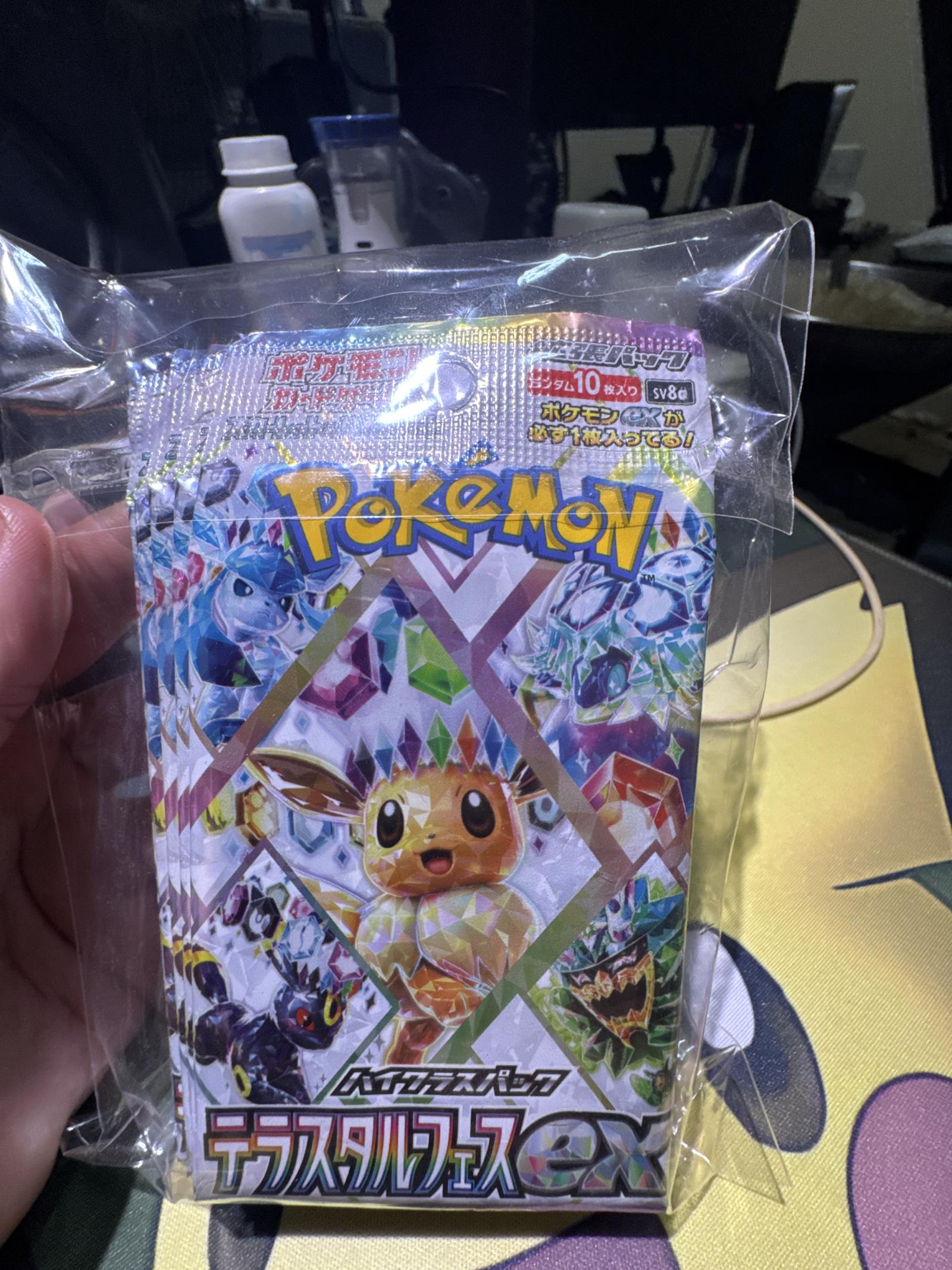 This is a booster pack from the Pokemon TCG set Terastal Festa ex (SV8d), featuring artwork of Eevee and other Pokemon in a terastal crystal style. The pack is in Japanese and sealed, suitable for collectors or players wanting to explore the set. The product includes 10 cards per pack.