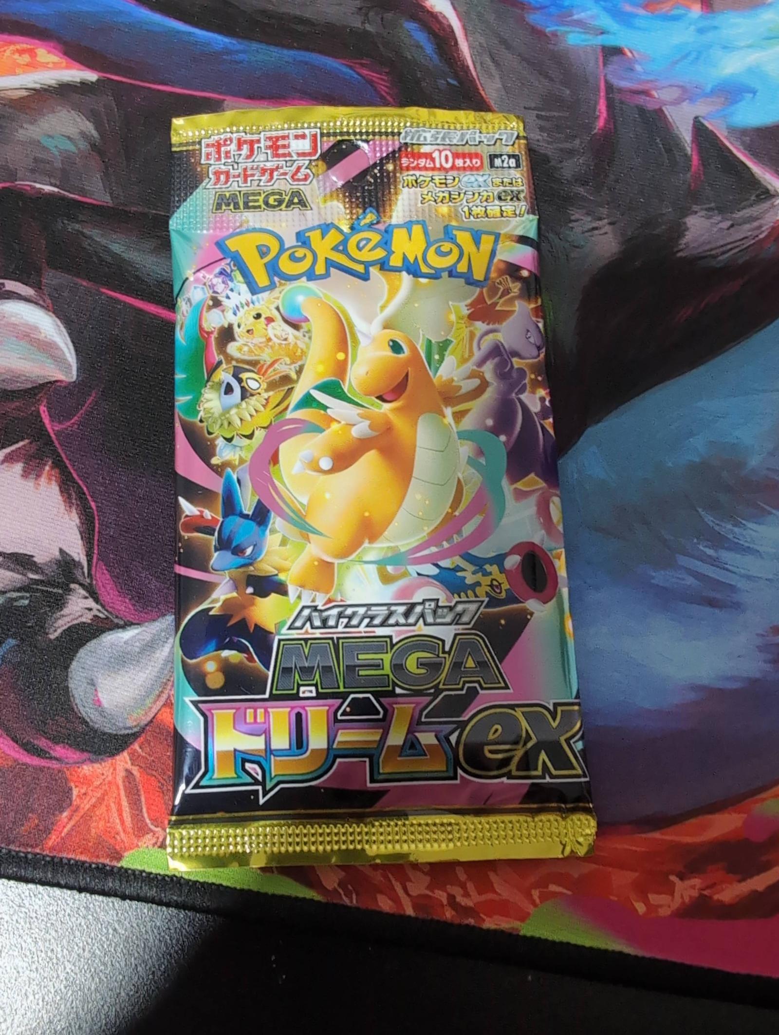 Japanese booster pack from the Pokemon TCG 'Mega Dream EX' set. Contains 10 random cards per pack featuring various Pokemon including Dragonite and Mega Evolutions. Foil cards possible. This booster is collectible and sought after by collectors of Japanese Pokemon cards.