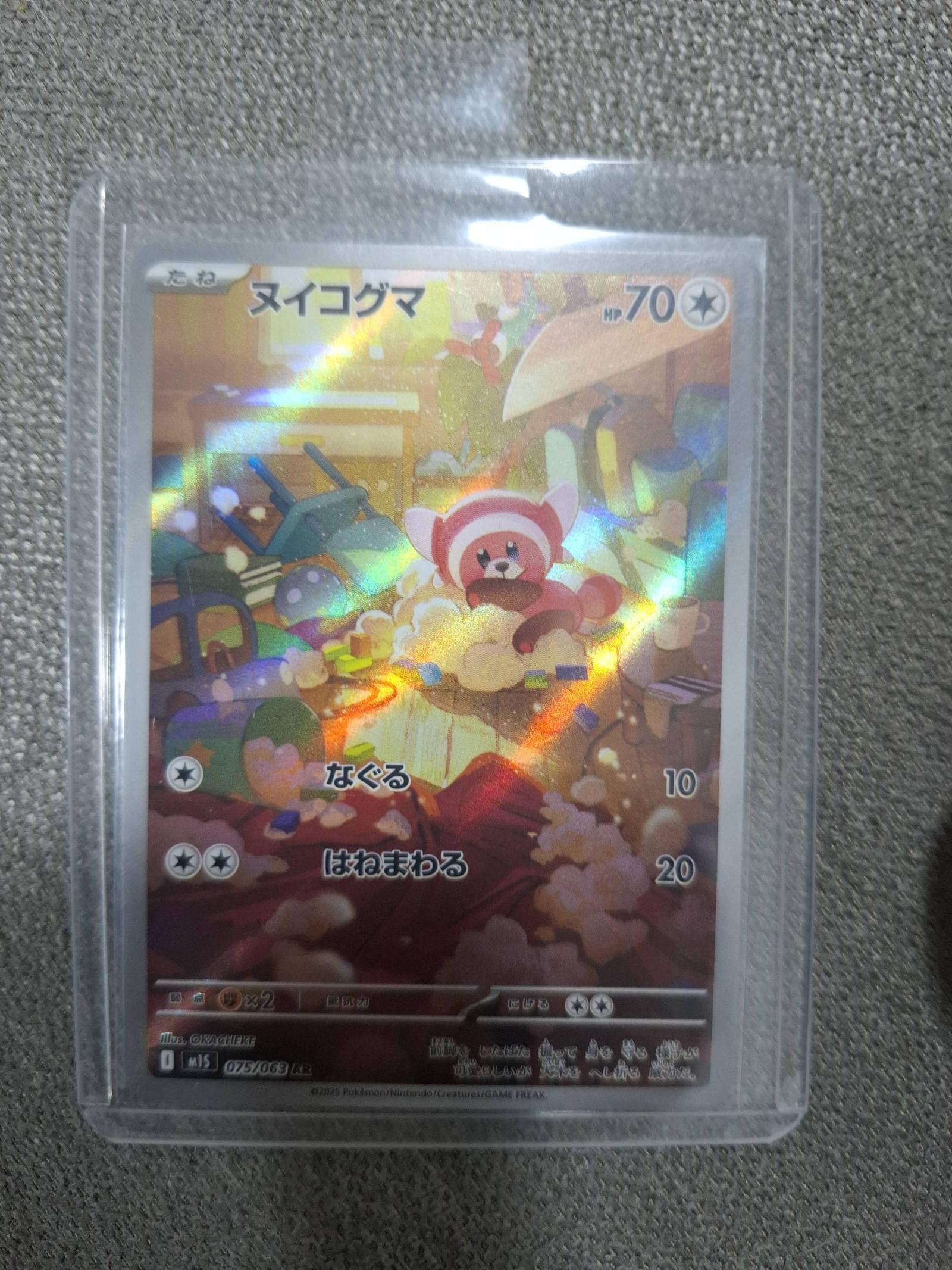Japanese holo foil Pokemon card featuring Stufful (ヌイコグマ) from the M15 set. Card number 75/063 with artist OKAZAKI. Playable in the Pokémon TCG meta. Card code 075/063. Foil with normal printing treatment.