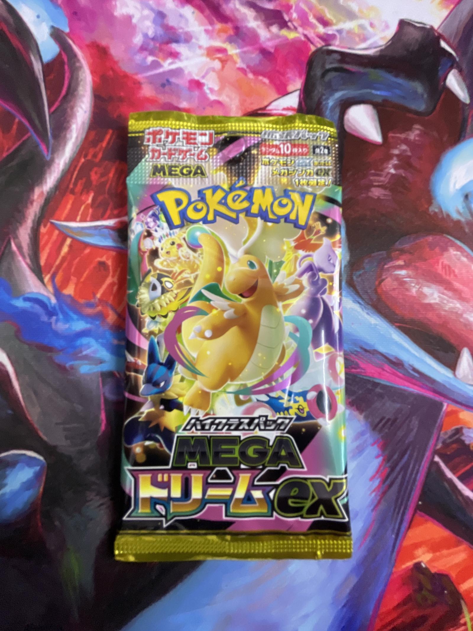 Mega Dream ex Japanese booster pack from the Mega Dream ex set featuring Dream World Pokémon and Mega Evolutions. The pack is a Japanese language edition and contains standard cards. This pack is collectible and sought after by collectors due to its unique Japanese packaging and artwork.