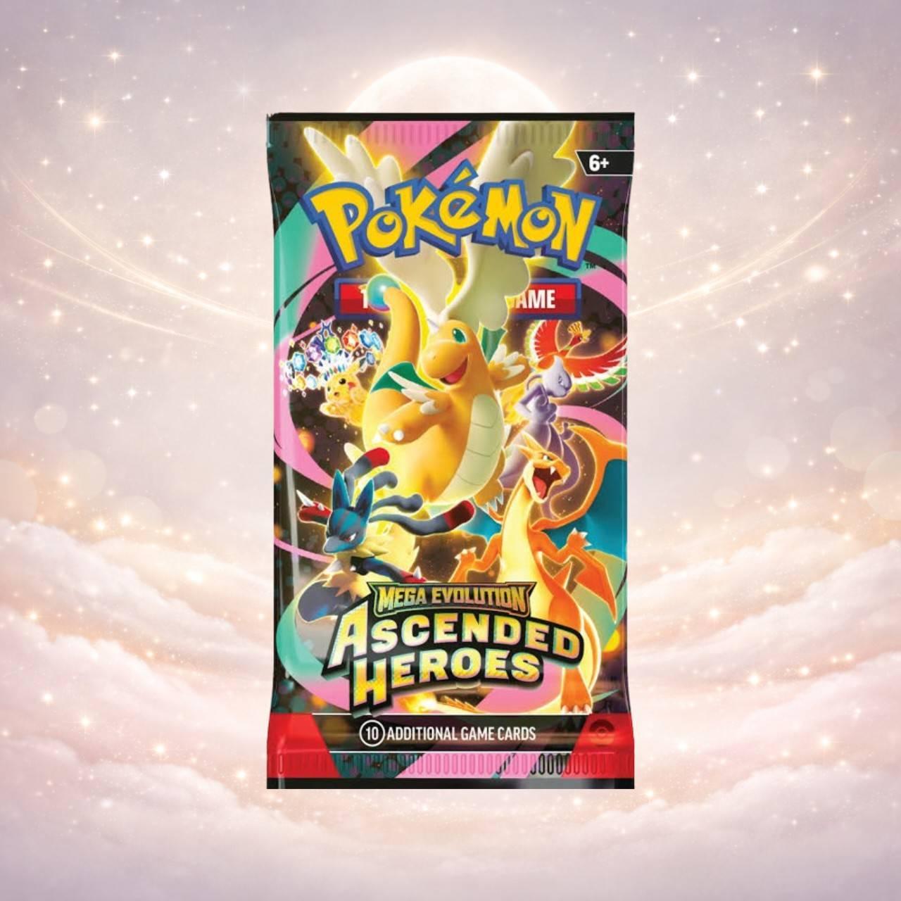 Sealed Pokemon TCG booster pack from the Mega Evolution Ascended Heroes set. Contains 10 additional game cards. Perfect for collectors and players looking to enhance their decks with new cards from the set.