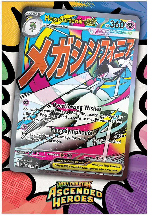 With strong attacks and big HP, Mega Lucario ex and Mega Gardevoir ex break through boundaries in battle! Team up with one of these powerful Mega Evolution Pokémon ex as a full-art foil promo card , then find even more Pokémon inside a stack of 10 booster packs from Mega Evolution—Ascended Heroes. You’ll also get a large poster showing off Mega Lucario or Mega Gardevoir and other Pokémon featured in this special expansion.