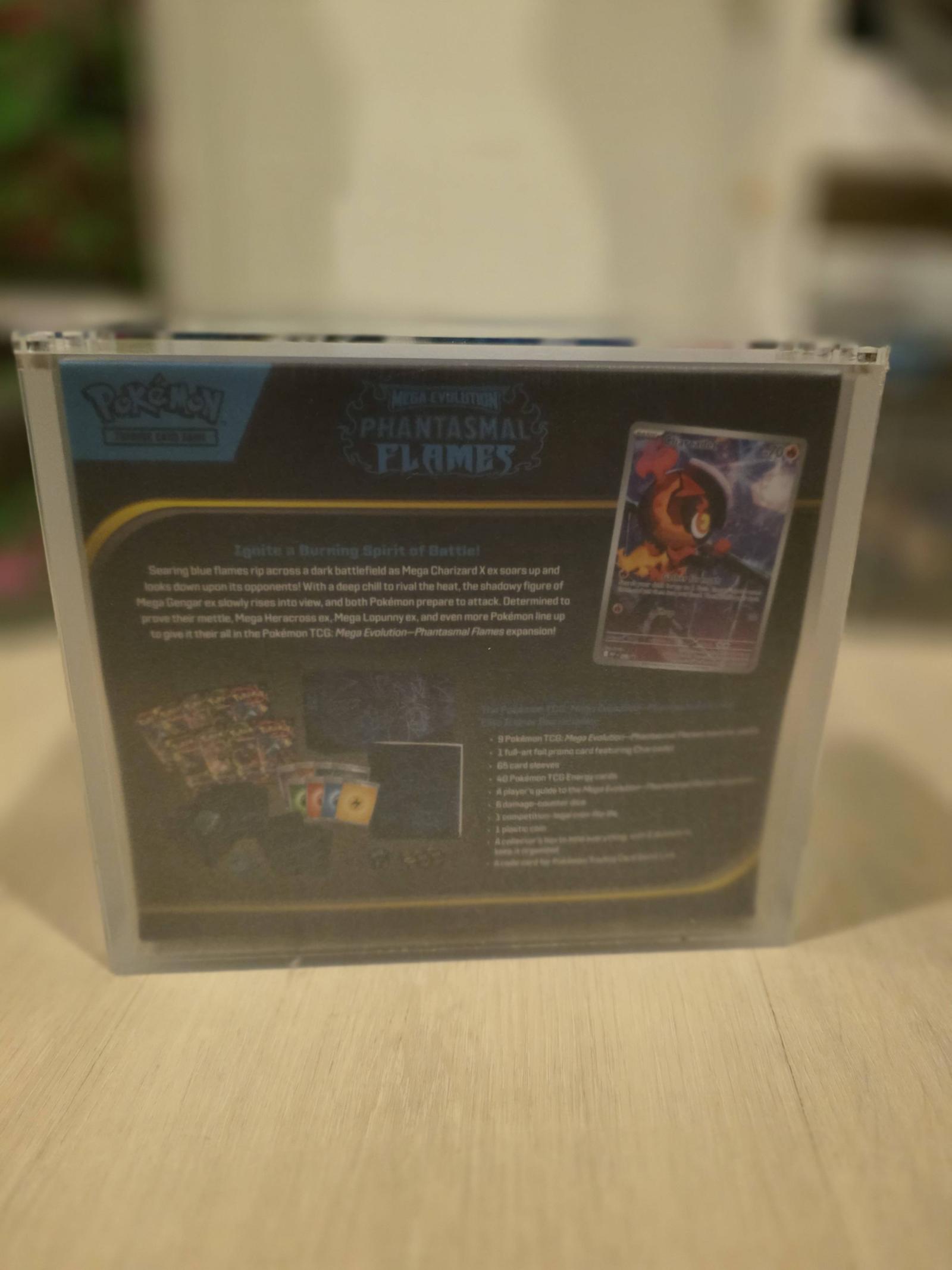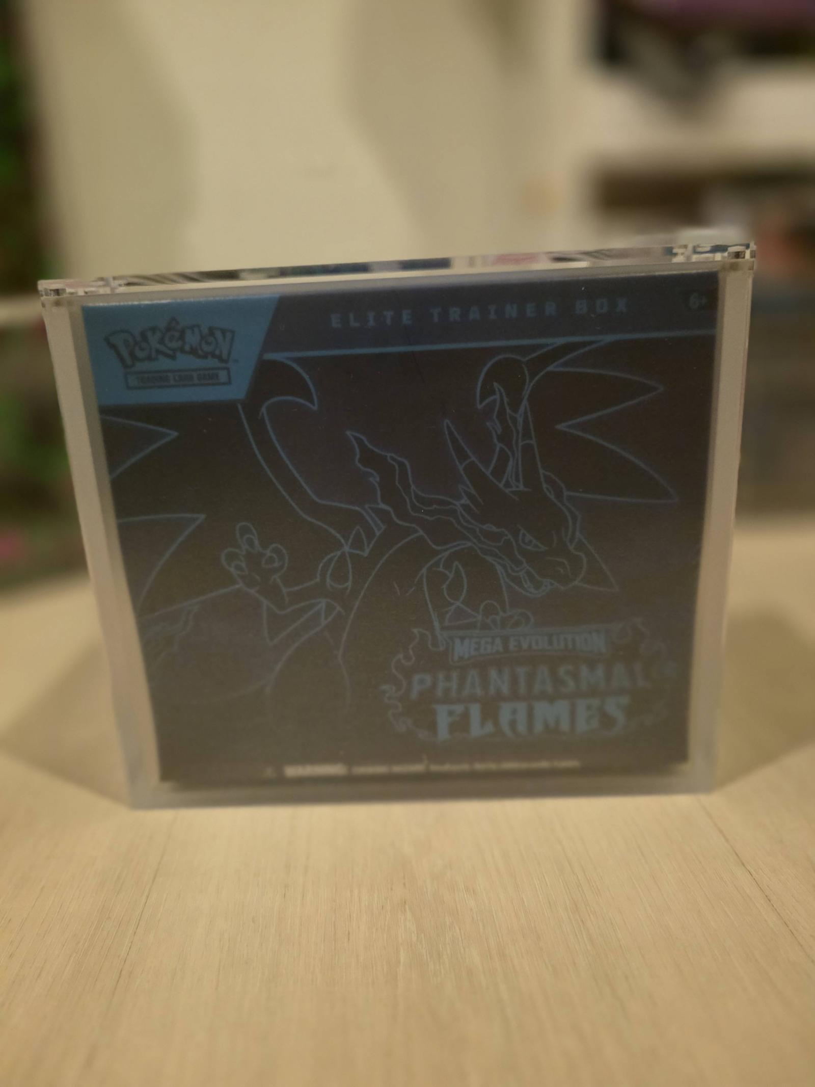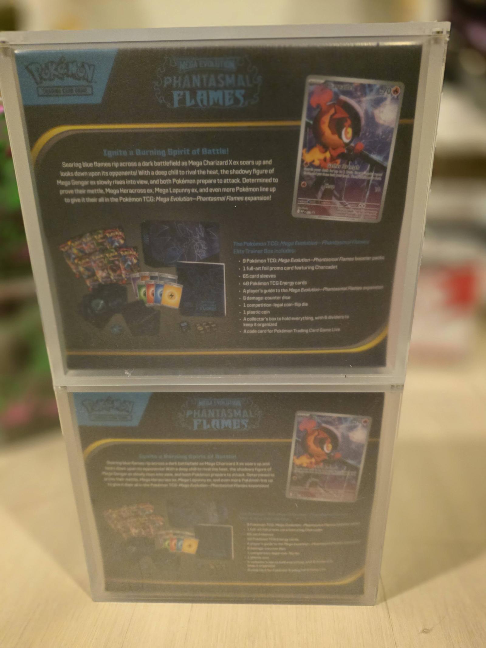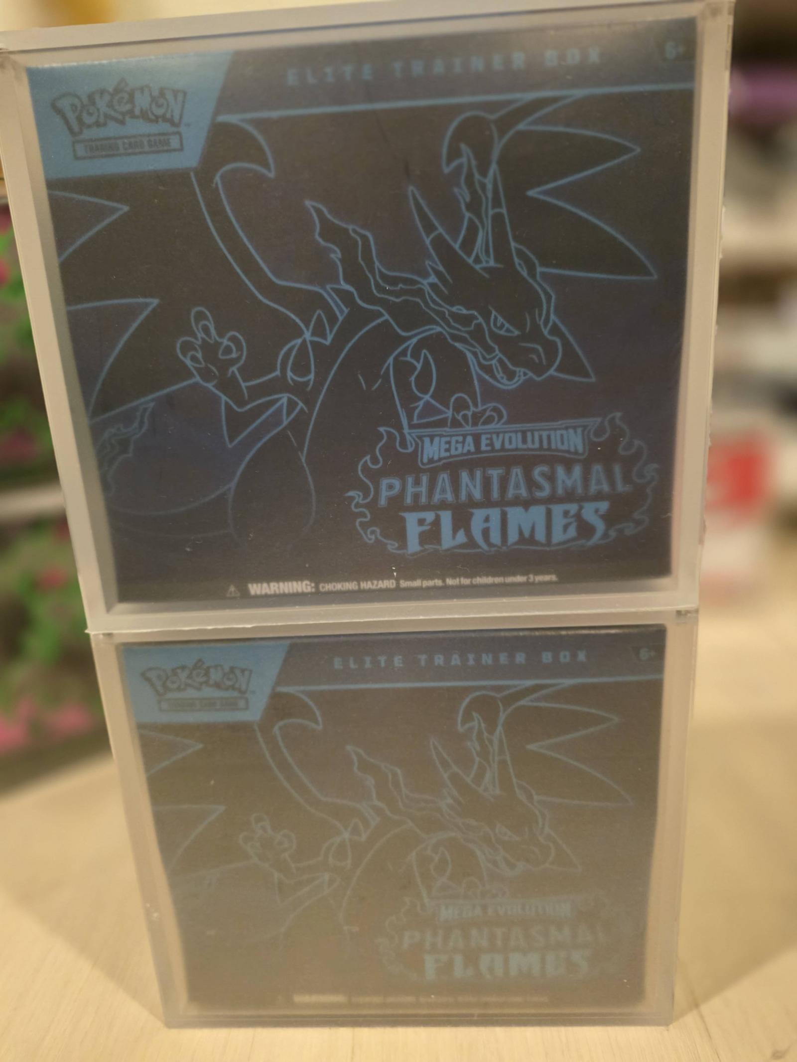 Elite Trainer Box from the Mega Evolution Phantasmal Flames set. Includes 9 Pokemon TCG: Mega Evolution booster packs, 1 full-art foil promo card, 65 card sleeves, damage counter dice, a player's guide, and more. Great collectible and playable in the current meta with Mega Evolution cards. The box artwork features Mega Charizard X and Mega Gengar.