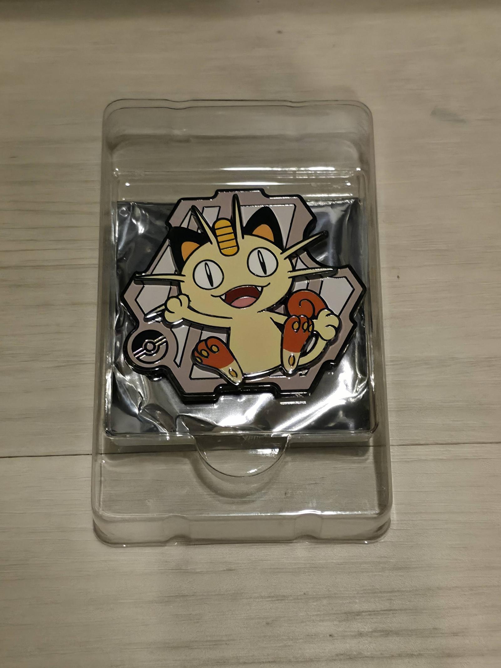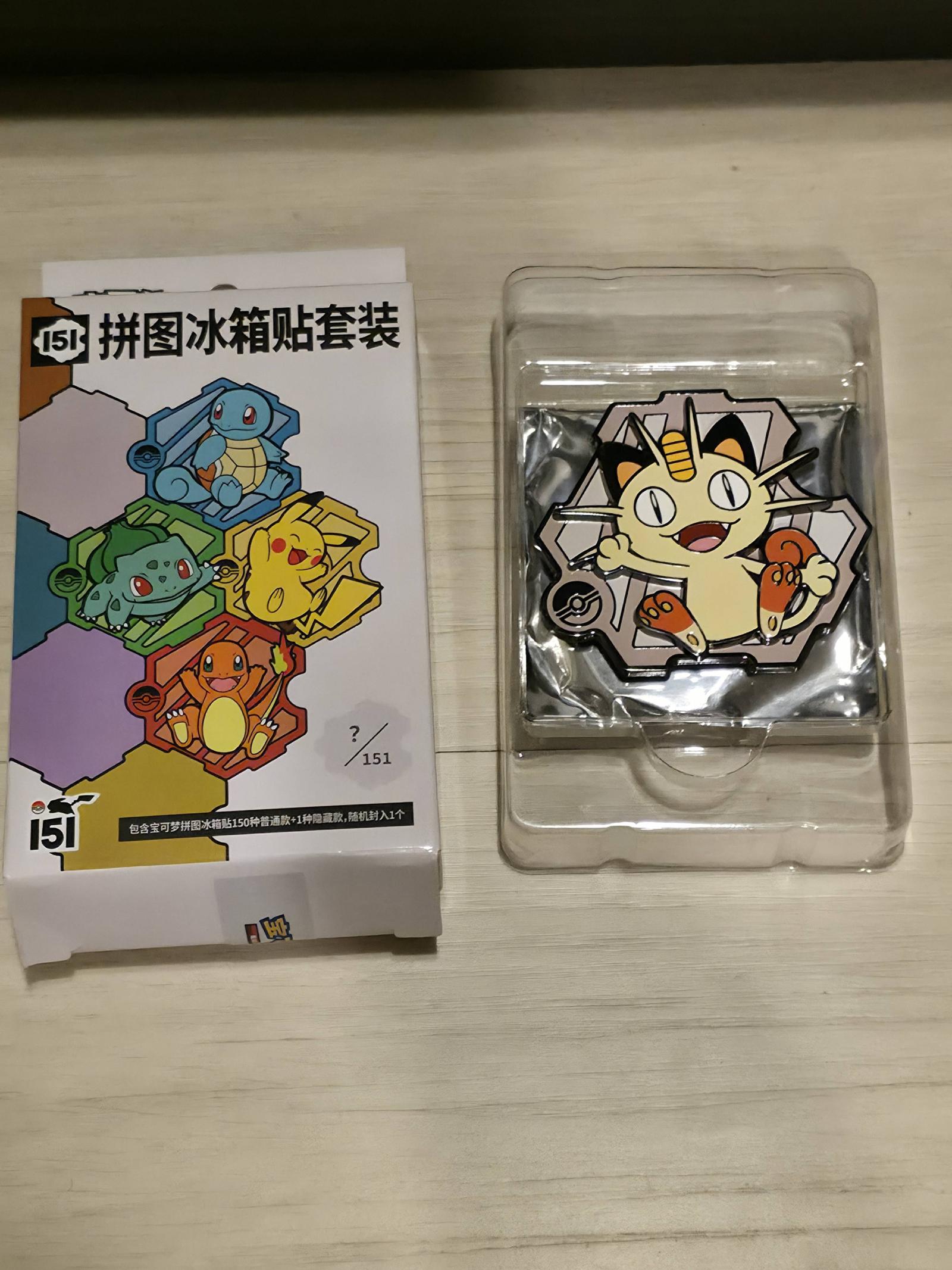 This product is a collectible fridge magnet puzzle piece featuring Meowth from the original 151 Pokemon. It is not a playable card but a merchandise collectible item related to Pokemon TCG. The packaging shows the first generation starters and Pikachu. The set includes 151 puzzle pieces, this being one of the popular piece. Magnet only, no pack