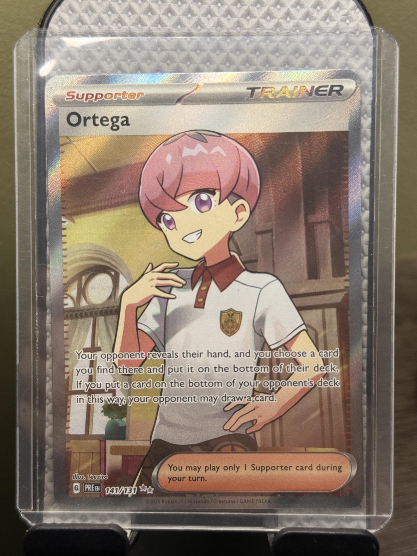 Ortega (141/131) is a full art Trainer Supporter card from the Pokemon TCG set PRE. Illustration by Teeziro. English language. The card is foil and collectible. It is playable in the meta as a Supporter card.