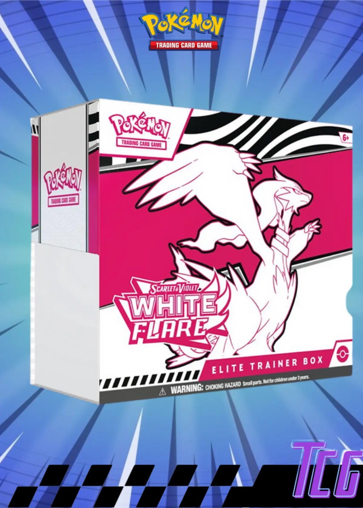 The Scarlet & Violet White Flare set is known for its exciting new cards and mechanics, making this Elite Trainer Box valuable for both competitive play and collectors. The bold white and pink design with the featured Pokemon makes it a standout piece for any Pokemon TCG enthusiast.